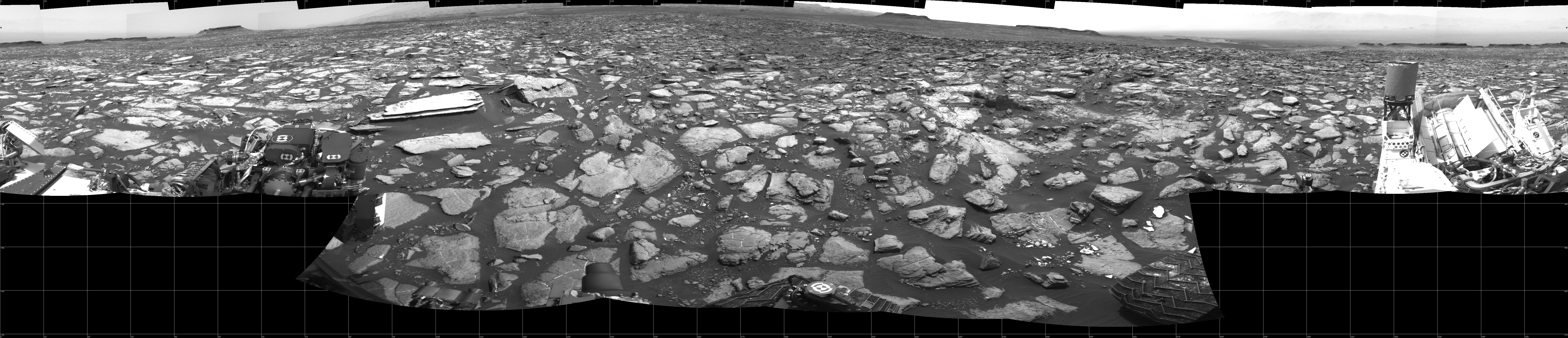 NASA's Mars rover Curiosity took 17 images in Gale Crater using its mast-mounted Left Navigation Camera (Navcam) to create this mosaic. The seam-corrected mosaic provides a 360-degree cylindrical projection panorama of the Martian surface centered at 180 degrees azimuth (measured clockwise from north). Curiosity took the images on October 27, 2016, Sol 1502 of the Mars Science Laboratory mission at drive 2946, site number 58. The local mean solar time for the image exposures was from 1 PM to 2 PM. Each Navcam image has a 45 degree field of view. CREDIT: NASA/JPL-Caltech