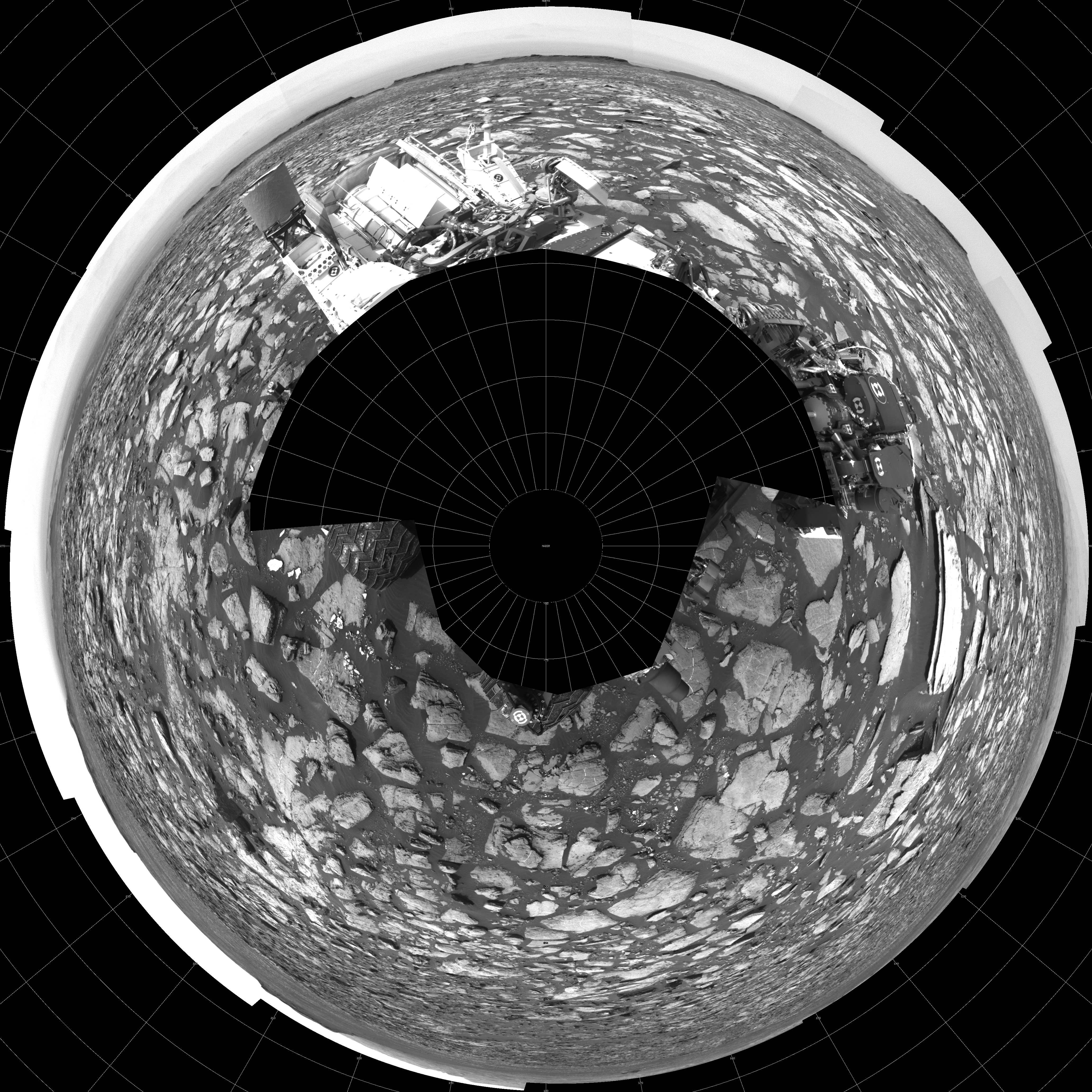 NASA's Mars rover Curiosity took 17 images in Gale Crater using its mast-mounted Left Navigation Camera (Navcam) to create this mosaic. The seam-corrected mosaic provides a polar stereographic projection panorama of the Martian surface with 0 degrees azimuth (measured clockwise from north) at the top of the image. Curiosity took the images on October 27, 2016, Sol 1502 of the Mars Science Laboratory mission at drive 2946, site number 58. The local mean solar time for the image exposures was from 1 PM to 2 PM. Each Navcam image has a 45-degree field of view. CREDIT: NASA/JPL-Caltech