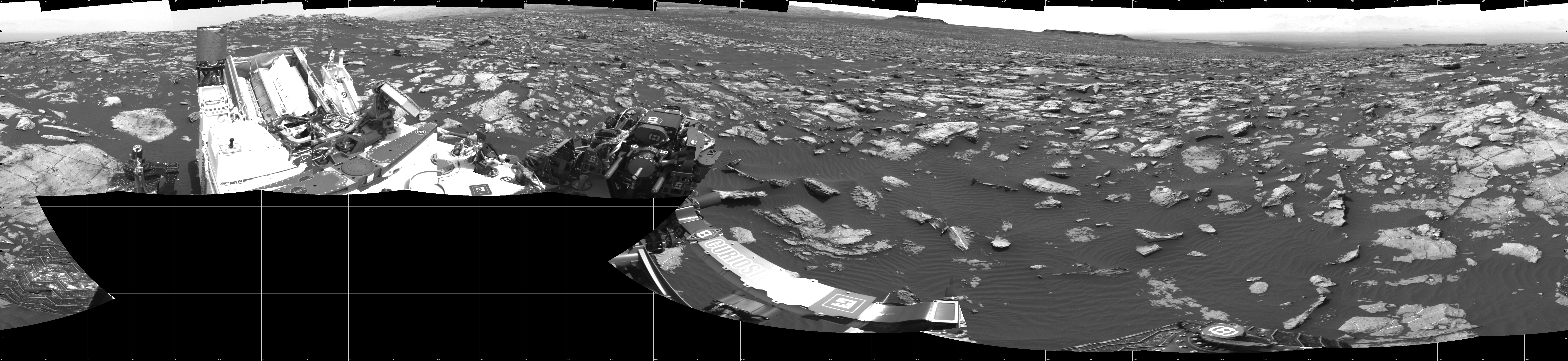 NASA's Mars rover Curiosity took 17 images in Gale Crater using its mast-mounted Left Navigation Camera (Navcam) to create this mosaic. The seam-corrected mosaic provides a 360-degree cylindrical projection panorama of the Martian surface centered at 180 degrees azimuth (measured clockwise from north). Curiosity took the images on November 02, 2016, Sol 1507 of the Mars Science Laboratory mission at drive 612, site number 59. The local mean solar time for the image exposures was 2 PM. Each Navcam image has a 45 degree field of view. CREDIT: NASA/JPL-Caltech