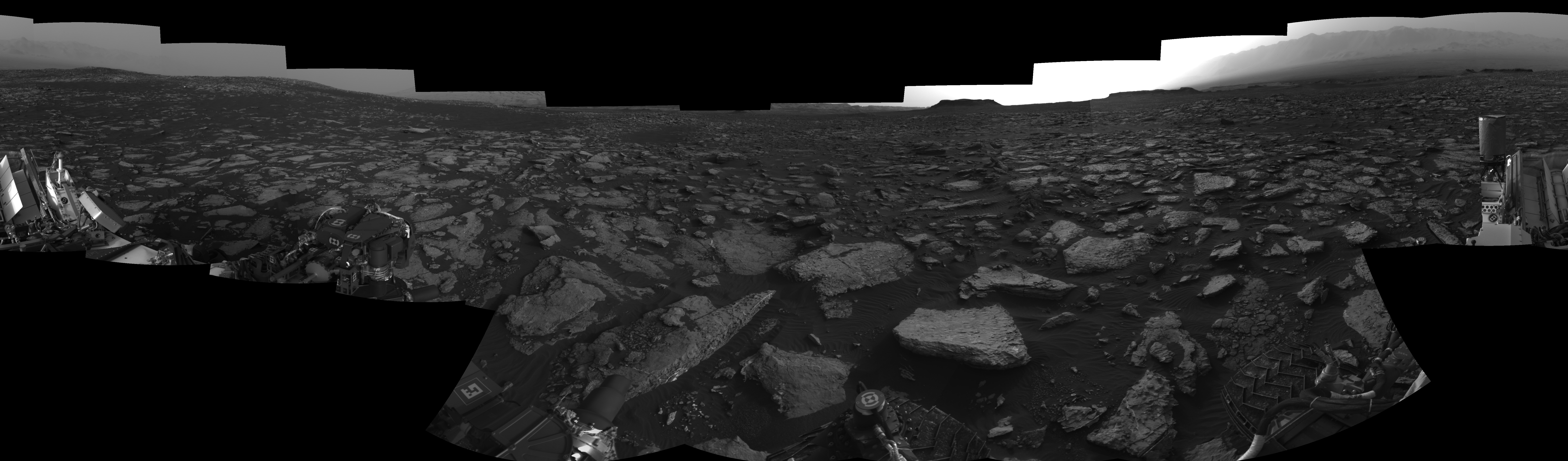 NASA's Mars rover Curiosity took 17 images in Gale Crater using its mast-mounted Right Navigation Camera (Navcam) to create this mosaic. The seam-corrected mosaic provides a 360-degree cylindrical-perspective projection panorama of the Martian surface suitable for stereo viewing, centered at 12 degrees azimuth (measured clockwise from north). This single-eye view must be combined with the partner left image to be viewed in stereo. Curiosity took the images on November 07, 2016, Sol 1512 of the Mars Science Laboratory mission at drive 1596, site number 59. The local mean solar time for the image exposures was from 4 PM to 5 PM. Each Navcam image has a 45-degree field of view. CREDIT: NASA/JPL-Caltech