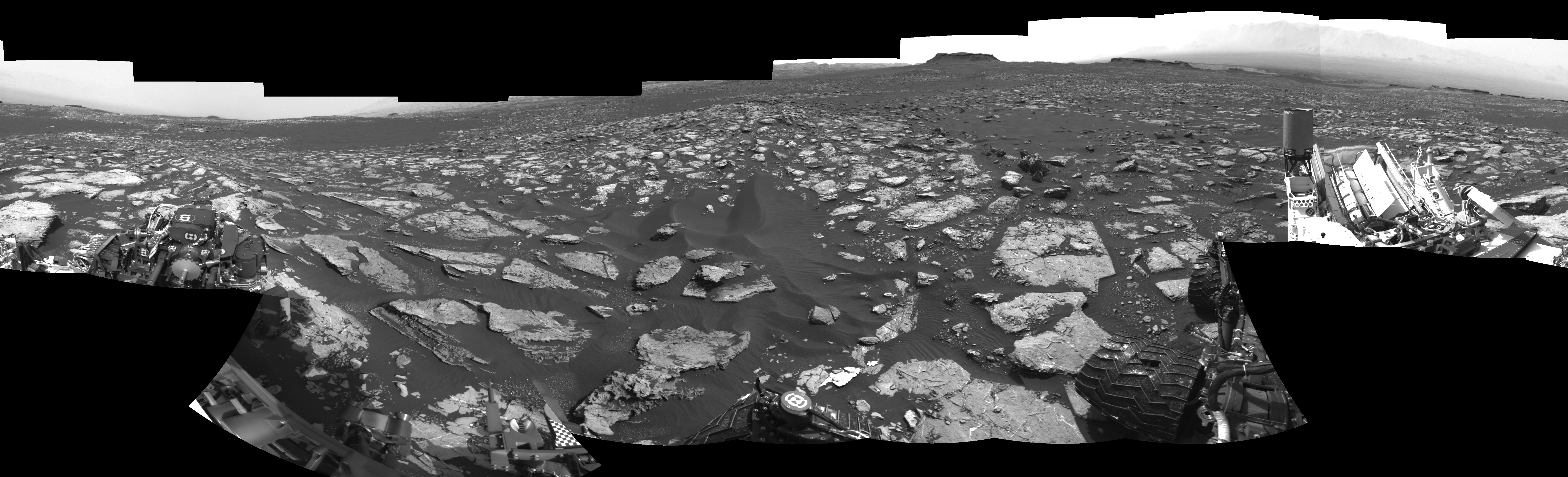 NASA's Mars rover Curiosity took 18 images in Gale Crater using its mast-mounted Left Navigation Camera (Navcam) to create this mosaic. The seam-corrected mosaic provides a 360-degree cylindrical-perspective projection panorama of the Martian surface suitable for stereo viewing, centered at 71 degrees azimuth (measured clockwise from north). This single-eye view must be combined with the partner right image to be viewed in stereo. Curiosity took the images on November 16, 2016, Sol 1521 of the Mars Science Laboratory mission at drive 2668, site number 59. The local mean solar time for the image exposures was 2 PM. Each Navcam image has a 45-degree field of view. CREDIT: NASA/JPL-Caltech