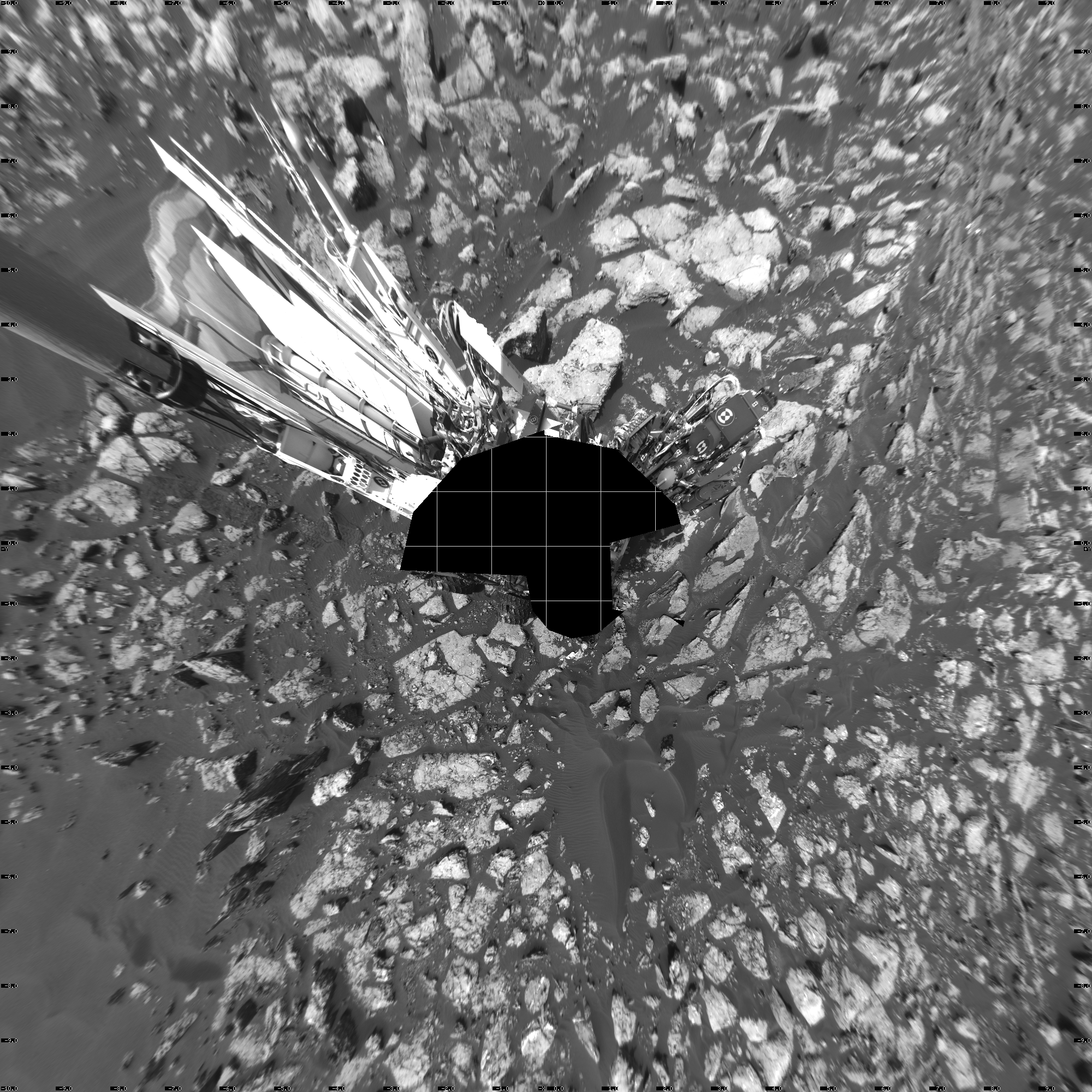 NASA's Mars rover Curiosity took 18 images in Gale Crater using its mast-mounted Left Navigation Camera (Navcam) to create this mosaic. The seam-corrected mosaic provides a vertical projection of the Martian surface near the rover, covering an area of 20 meters (north/south) by 20 meters (east/west). North is up in the image. This projection provides an overhead view, but introduces distortion for items not on the surface, such as large rocks and the rover itself. Curiosity took the images on November 16, 2016, Sol 1521 of the Mars Science Laboratory mission at drive 2668, site number 59. The local mean solar time for the image exposures was 2 PM. Each Navcam image has a 45-degree field of view. CREDIT: NASA/JPL-Caltech