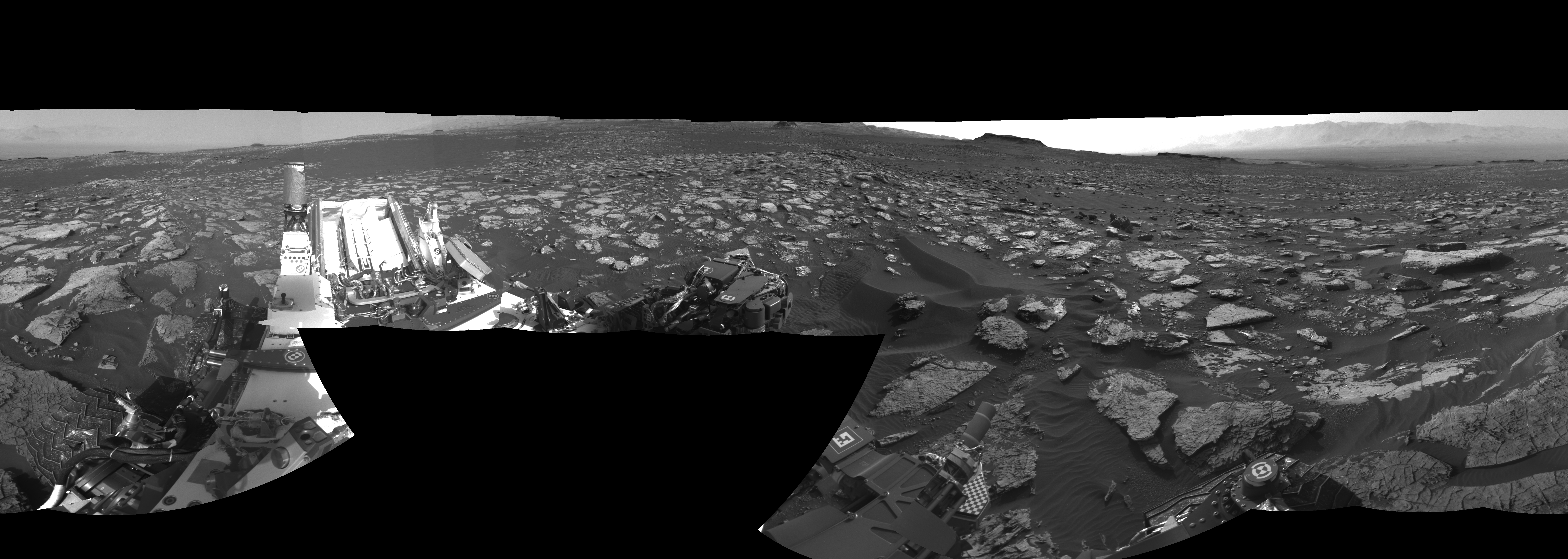 NASA's Mars rover Curiosity took 19 images in Gale Crater using its mast-mounted Right Navigation Camera (Navcam) to create this mosaic. The seam-corrected mosaic provides a 360-degree cylindrical-perspective projection panorama of the Martian surface suitable for stereo viewing, centered at 288 degrees azimuth (measured clockwise from north). This single-eye view must be combined with the partner left image to be viewed in stereo. Curiosity took the images on December 21, 2016, Sol 1555 of the Mars Science Laboratory mission at drive 3016, site number 59. The local mean solar time for the image exposures was 4 PM. Each Navcam image has a 45-degree field of view. CREDIT: NASA/JPL-Caltech