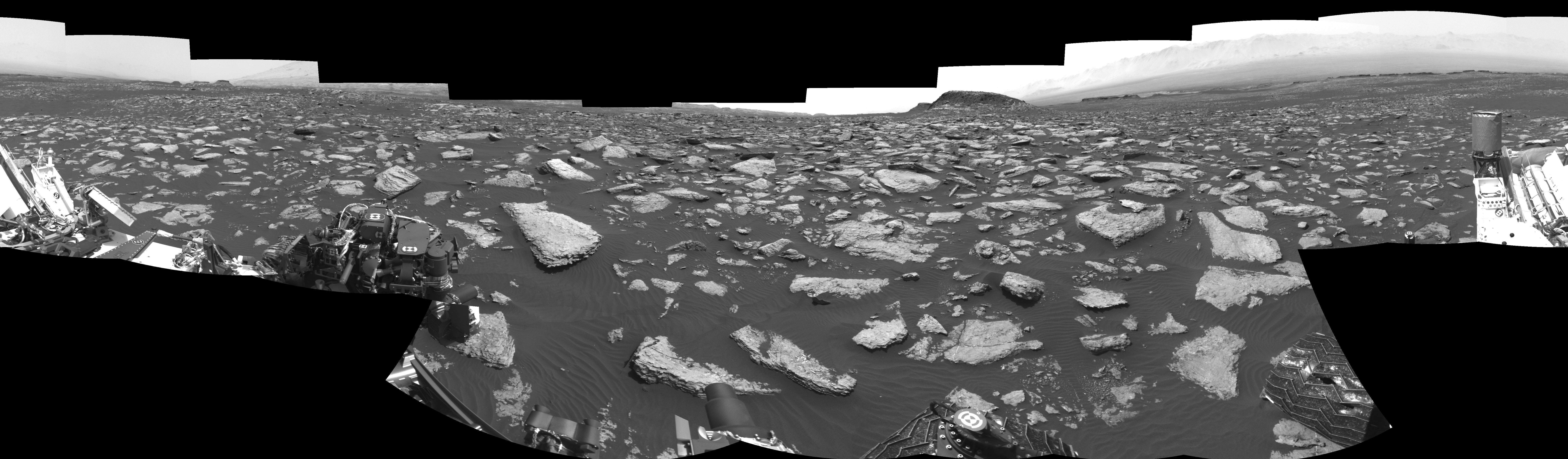 NASA's Mars rover Curiosity took 17 images in Gale Crater using its mast-mounted Left Navigation Camera (Navcam) to create this mosaic. The seam-corrected mosaic provides a 360-degree cylindrical-perspective projection panorama of the Martian surface suitable for stereo viewing, centered at 28 degrees azimuth (measured clockwise from north). This single-eye view must be combined with the partner right image to be viewed in stereo. Curiosity took the images on January 23, 2017, Sol 1587 of the Mars Science Laboratory mission at drive 2010, site number 60. The local mean solar time for the image exposures was from 2 PM to 3 PM. Each Navcam image has a 45-degree field of view. CREDIT: NASA/JPL-Caltech