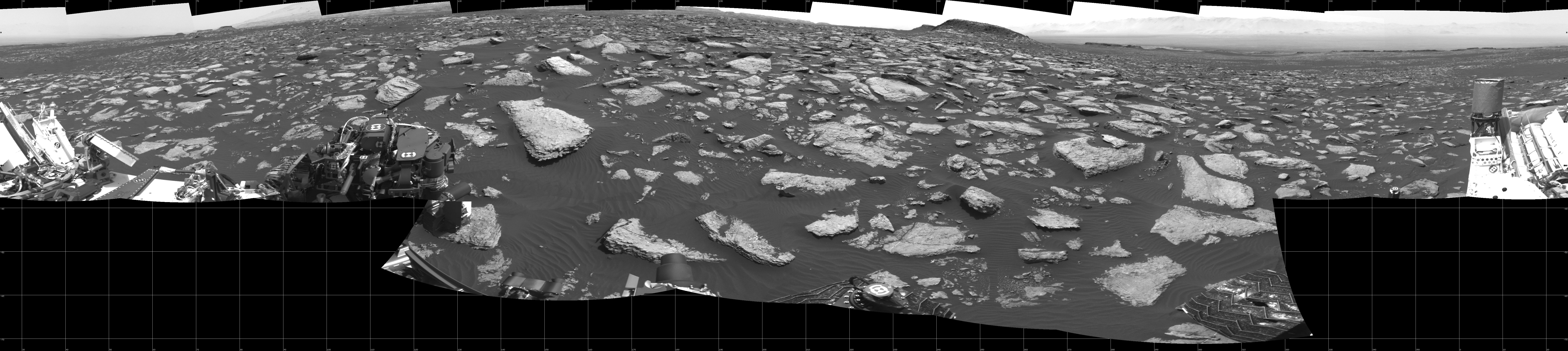 NASA's Mars rover Curiosity took 17 images in Gale Crater using its mast-mounted Left Navigation Camera (Navcam) to create this mosaic. The seam-corrected mosaic provides a 360-degree cylindrical projection panorama of the Martian surface centered at 205 degrees azimuth (measured clockwise from north). Curiosity took the images on January 23, 2017, Sol 1587 of the Mars Science Laboratory mission at drive 2010, site number 60. The local mean solar time for the image exposures was from 2 PM to 3 PM. Each Navcam image has a 45 degree field of view. CREDIT: NASA/JPL-Caltech