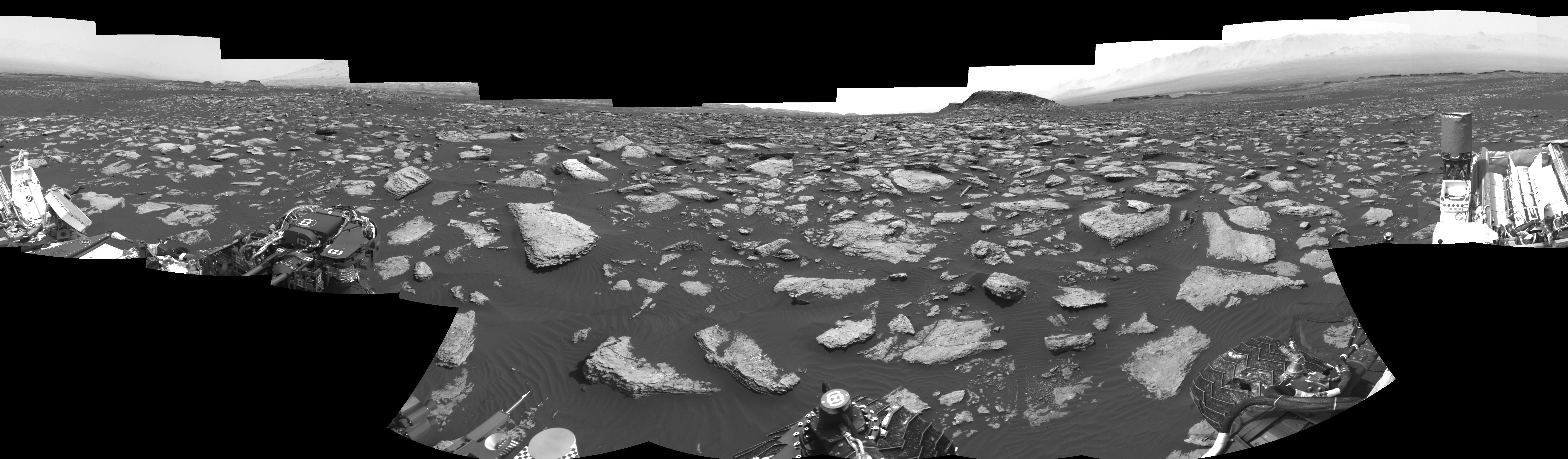 NASA's Mars rover Curiosity took 17 images in Gale Crater using its mast-mounted Right Navigation Camera (Navcam) to create this mosaic. The seam-corrected mosaic provides a 0-degree cylindrical-perspective projection panorama of the Martian surface suitable for stereo viewing, centered at 201 degrees azimuth (measured clockwise from north). This single-eye view must be combined with the partner left image to be viewed in stereo. Curiosity took the images on January 23, 2017, Sol 1587 of the Mars Science Laboratory mission at drive 2010, site number 60. The local mean solar time for the image exposures was from 2 PM to 3 PM. Each Navcam image has a 45-degree field of view. CREDIT: NASA/JPL-Caltech