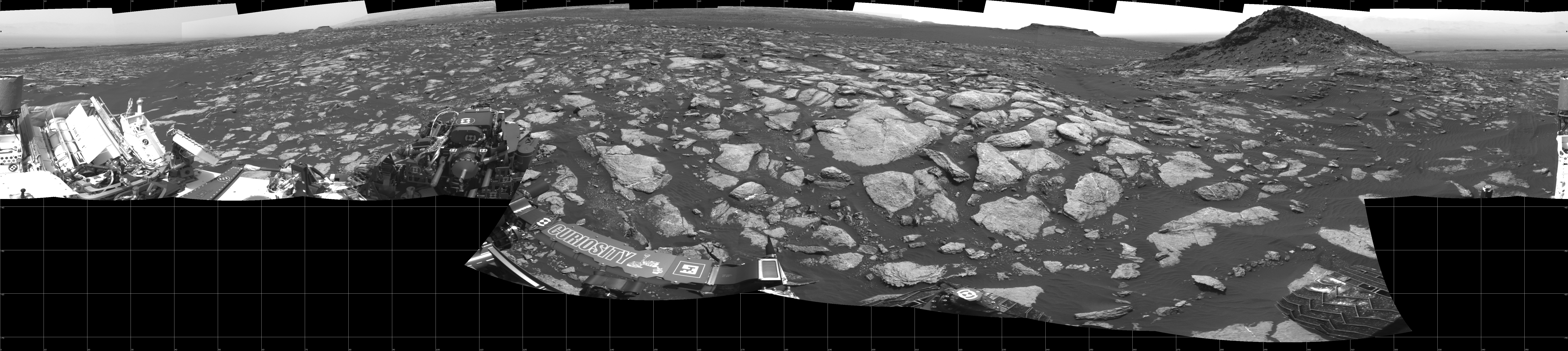 NASA's Mars rover Curiosity took 17 images in Gale Crater using its mast-mounted Left Navigation Camera (Navcam) to create this mosaic. The seam-corrected mosaic provides a 360-degree cylindrical projection panorama of the Martian surface centered at 180 degrees azimuth (measured clockwise from north). Curiosity took the images on February 15, 2017, Sol 1610 of the Mars Science Laboratory mission at drive 456, site number 61. The local mean solar time for the image exposures was from 2 PM to 3 PM. Each Navcam image has a 45 degree field of view. CREDIT: NASA/JPL-Caltech