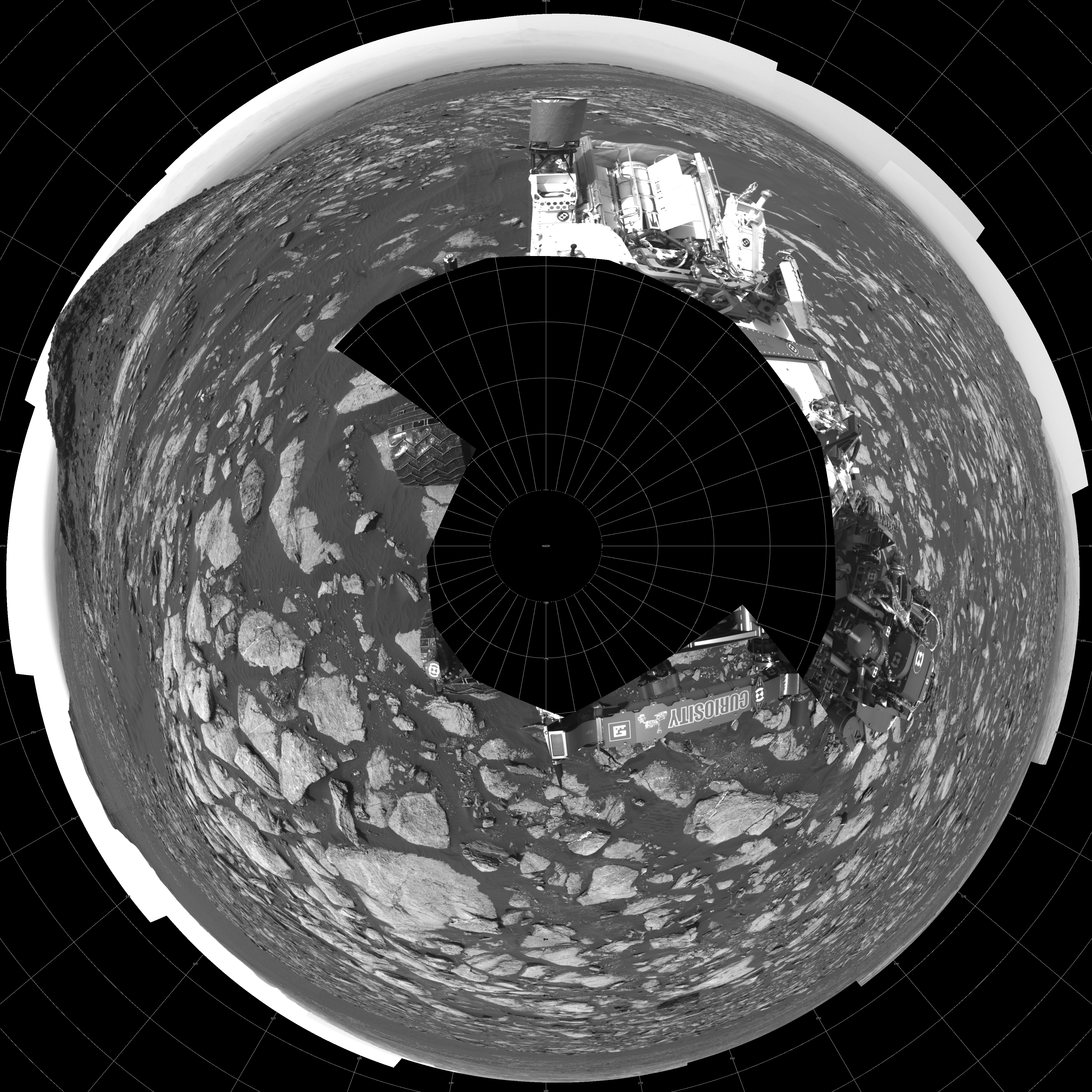 NASA's Mars rover Curiosity took 17 images in Gale Crater using its mast-mounted Left Navigation Camera (Navcam) to create this mosaic. The seam-corrected mosaic provides a polar stereographic projection panorama of the Martian surface with 0 degrees azimuth (measured clockwise from north) at the top of the image. Curiosity took the images on February 15, 2017, Sol 1610 of the Mars Science Laboratory mission at drive 456, site number 61. The local mean solar time for the image exposures was from 2 PM to 3 PM. Each Navcam image has a 45-degree field of view. CREDIT: NASA/JPL-Caltech