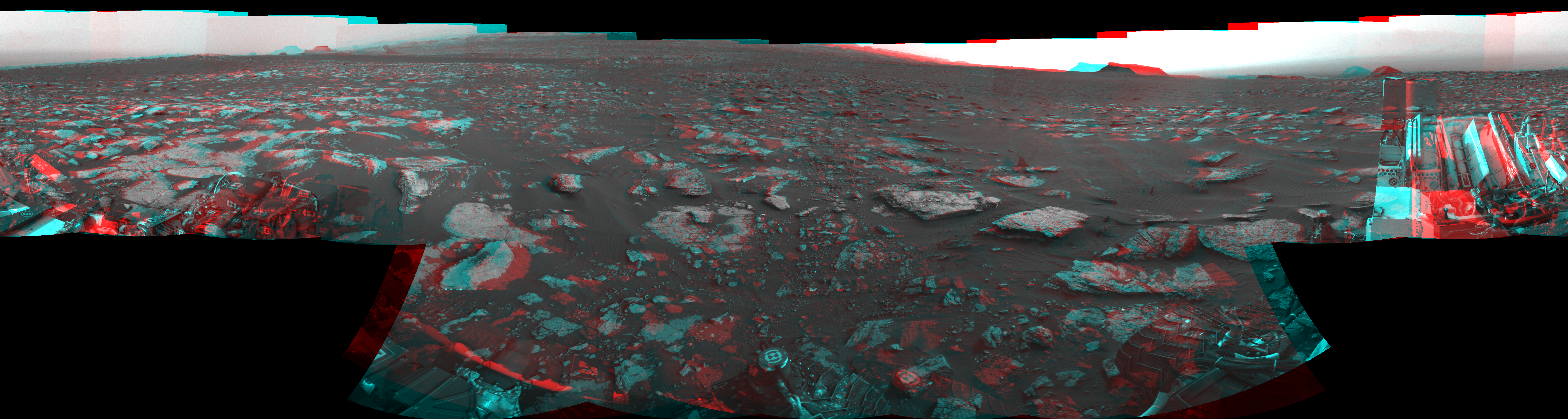 NASA's Mars rover Curiosity took 17 image pairs in Gale Crater using its mast-mounted Navigation Camera (Navcam) to create this mosaic. The seam-corrected mosaic provides a 360-degree cylindrical perspective projection panorama of the Martian surface suitable for stereo viewing, centered at 42 degrees azimuth (measured clockwise from north). This anaglyph must be viewed with red/blue glasses (red over left eye). Curiosity took the images on March 08, 2017, Sol 1630 of the Mars Science Laboratory mission at drive 1650, site number 61. The local mean solar time for the image exposures was 5 PM. Each Navcam image has a 45-degree field of view. CREDIT: NASA/JPL-Caltech