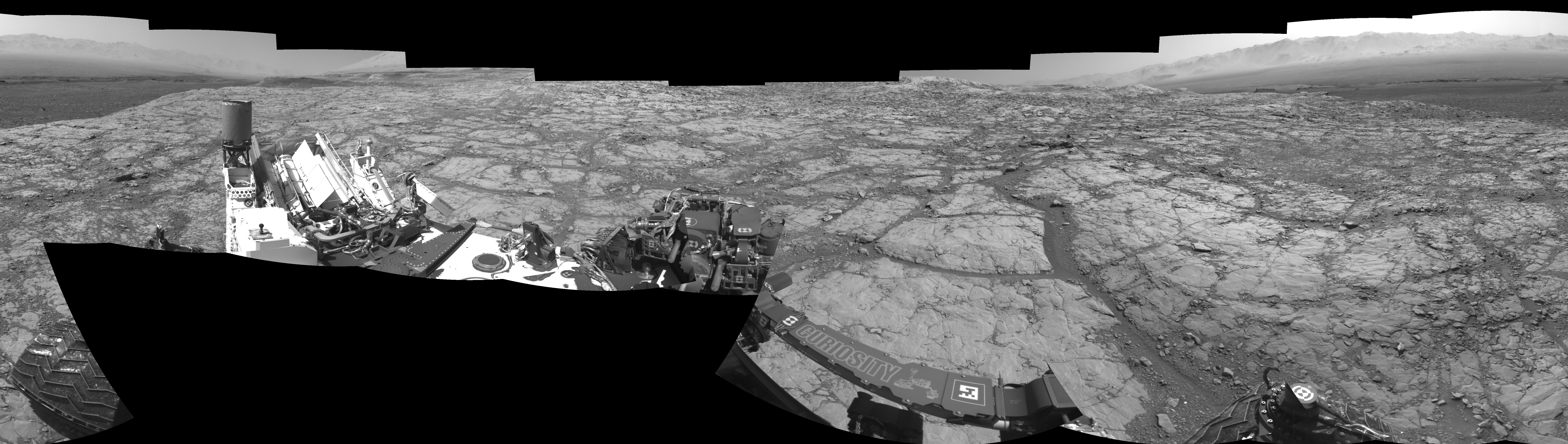 NASA's Mars rover Curiosity took 17 images in Gale Crater using its mast-mounted Left Navigation Camera (Navcam) to create this mosaic. The seam-corrected mosaic provides a 360-degree cylindrical-perspective projection panorama of the Martian surface suitable for stereo viewing, centered at 314 degrees azimuth (measured clockwise from north). This single-eye view must be combined with the partner right image to be viewed in stereo. Curiosity took the images on September 18, 2017, Sol 1819 of the Mars Science Laboratory mission at drive 246, site number 66. The local mean solar time for the image exposures was 2 PM. Each Navcam image has a 45-degree field of view. CREDIT: NASA/JPL-Caltech