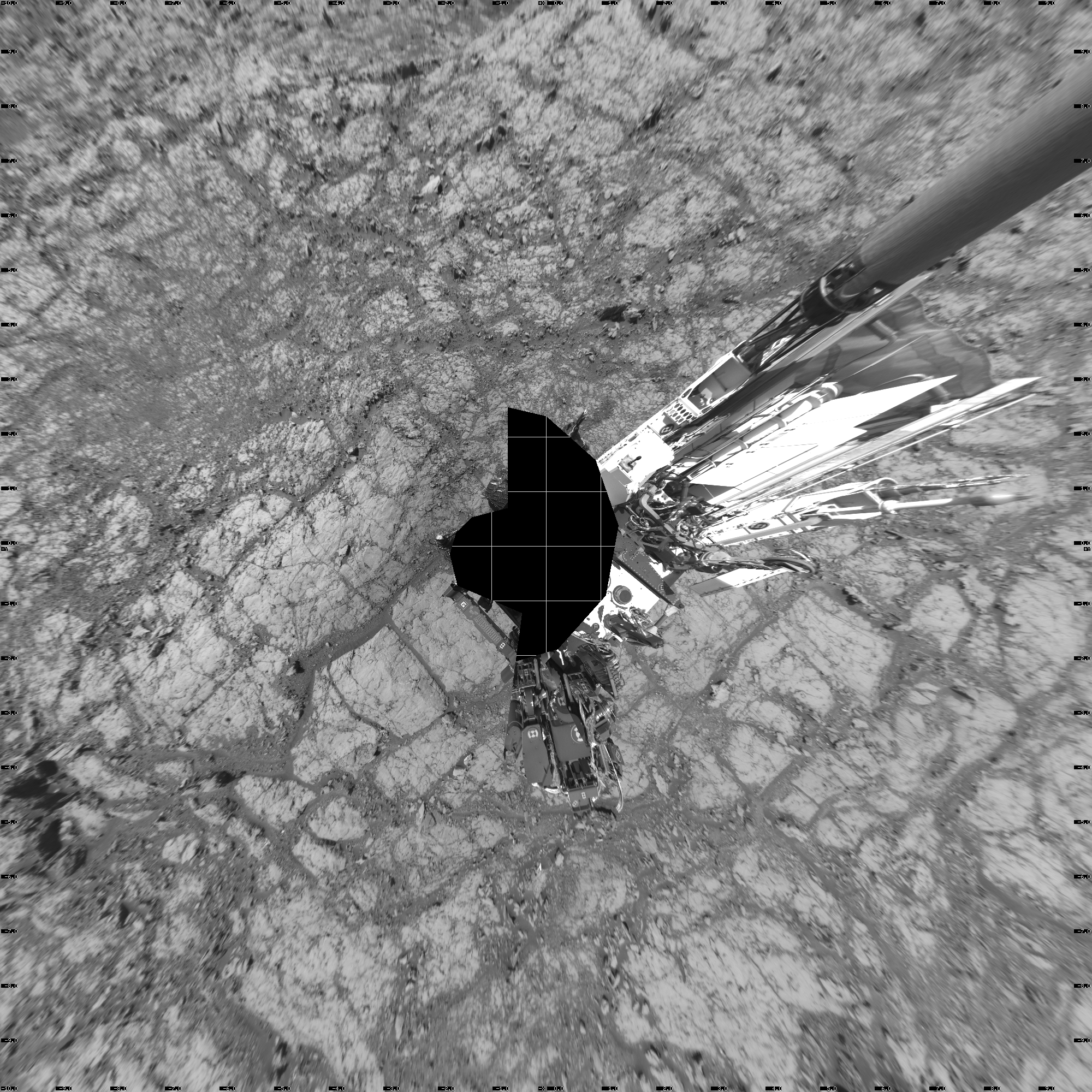 NASA's Mars rover Curiosity took 17 images in Gale Crater using its mast-mounted Left Navigation Camera (Navcam) to create this mosaic. The seam-corrected mosaic provides a vertical projection of the Martian surface near the rover, covering an area of 20 meters (north/south) by 20 meters (east/west). North is up in the image. This projection provides an overhead view, but introduces distortion for items not on the surface, such as large rocks and the rover itself. Curiosity took the images on September 18, 2017, Sol 1819 of the Mars Science Laboratory mission at drive 246, site number 66. The local mean solar time for the image exposures was 2 PM. Each Navcam image has a 45-degree field of view. CREDIT: NASA/JPL-Caltech