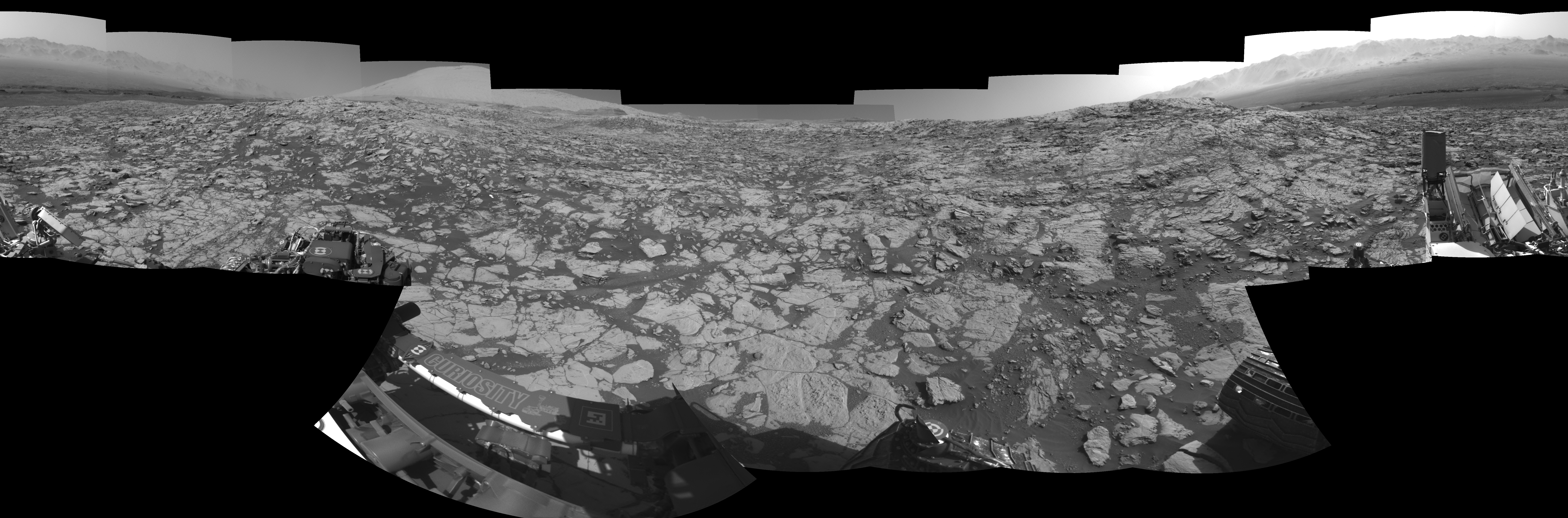 NASA's Mars rover Curiosity took 17 images in Gale Crater using its mast-mounted Left Navigation Camera (Navcam) to create this mosaic. The seam-corrected mosaic provides a 360-degree cylindrical-perspective projection panorama of the Martian surface suitable for stereo viewing, centered at 39 degrees azimuth (measured clockwise from north). This single-eye view must be combined with the partner right image to be viewed in stereo.  Curiosity took the images on September 26, 2017, Sol 1827 of the Mars Science Laboratory mission at drive 450, site number 66. The local mean solar time for the image exposures was 3 PM. Each Navcam image has a 45-degree field of view. CREDIT: NASA/JPL-Caltech