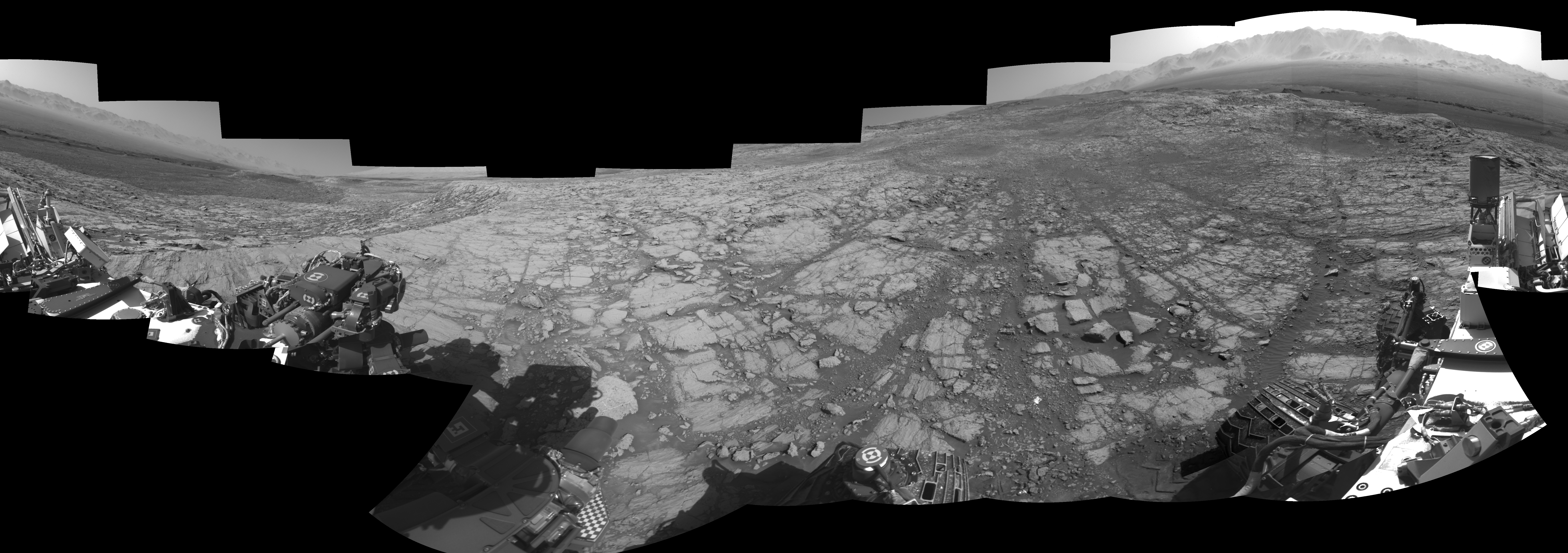 NASA's Mars rover Curiosity took 18 images in Gale Crater using its mast-mounted Right Navigation Camera (Navcam) to create this mosaic. The seam-corrected mosaic provides a 0-degree cylindrical-perspective projection panorama of the Martian surface suitable for stereo viewing, centered at 195 degrees azimuth (measured clockwise from north). This single-eye view must be combined with the partner left image to be viewed in stereo. Curiosity took the images on October 13, 2017, Sol 1843 of the Mars Science Laboratory mission at drive 1342, site number 66. The local mean solar time for the image exposures was 3 PM. Each Navcam image has a 45-degree field of view. CREDIT: NASA/JPL-Caltech