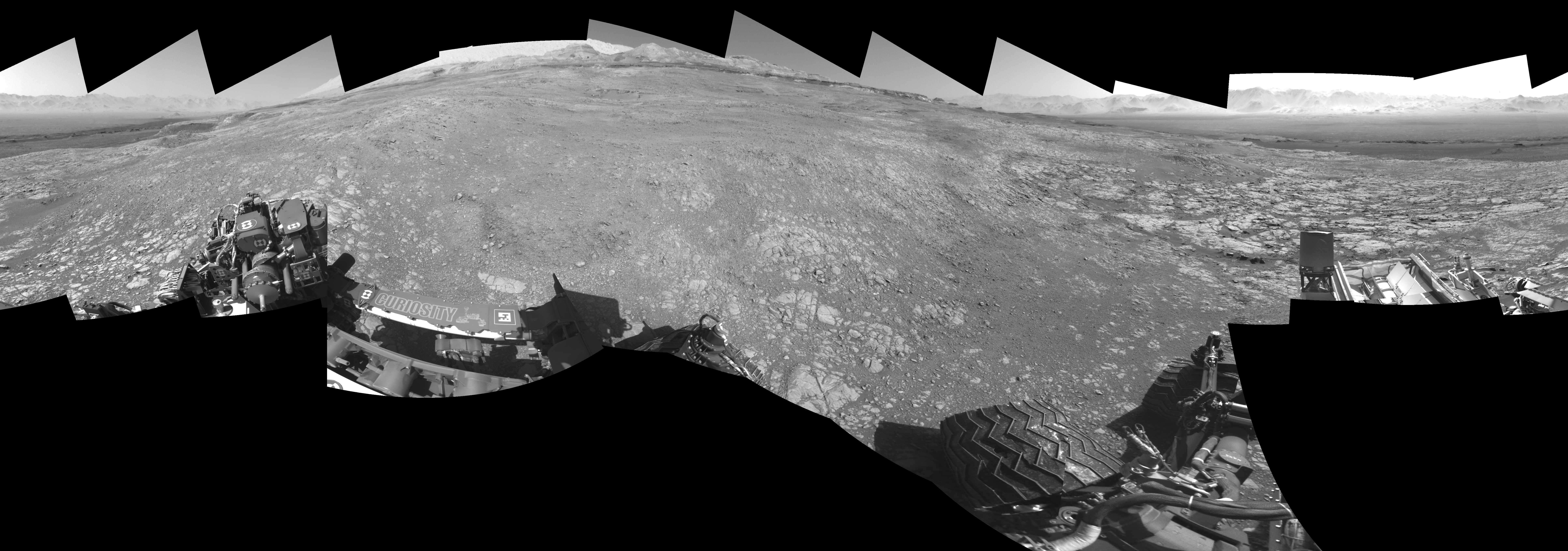 NASA's Mars rover Curiosity took 18 images in Gale Crater using its mast-mounted Left Navigation Camera (Navcam) to create this mosaic. The seam-corrected mosaic provides a 360-degree cylindrical-perspective projection panorama of the Martian surface suitable for stereo viewing, centered at 66 degrees azimuth (measured clockwise from north). This single-eye view must be combined with the partner right image to be viewed in stereo. Curiosity took the images on November 11, 2017, Sol 1871 of the Mars Science Laboratory mission at drive 2414, site number 66. The local mean solar time for the image exposures was 2 PM. Each Navcam image has a 45-degree field of view. CREDIT: NASA/JPL-Caltech