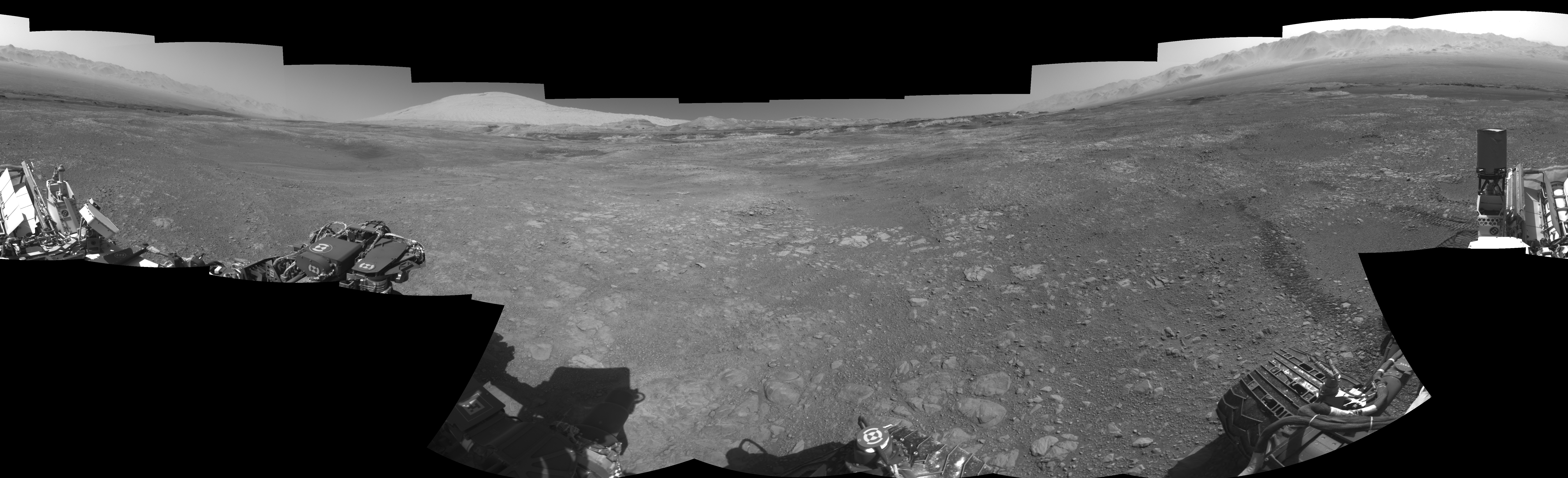 NASA's Mars rover Curiosity took 17 images in Gale Crater using its mast-mounted Right Navigation Camera (Navcam) to create this mosaic. The seam-corrected mosaic provides a 0-degree cylindrical-perspective projection panorama of the Martian surface suitable for stereo viewing, centered at 192 degrees azimuth (measured clockwise from north). This single-eye view must be combined with the partner left image to be viewed in stereo. Curiosity took the images on December 04, 2017, Sol 1894 of the Mars Science Laboratory mission at drive 806, site number 67. The local mean solar time for the image exposures was 2 PM. Each Navcam image has a 45-degree field of view. CREDIT: NASA/JPL-Caltech