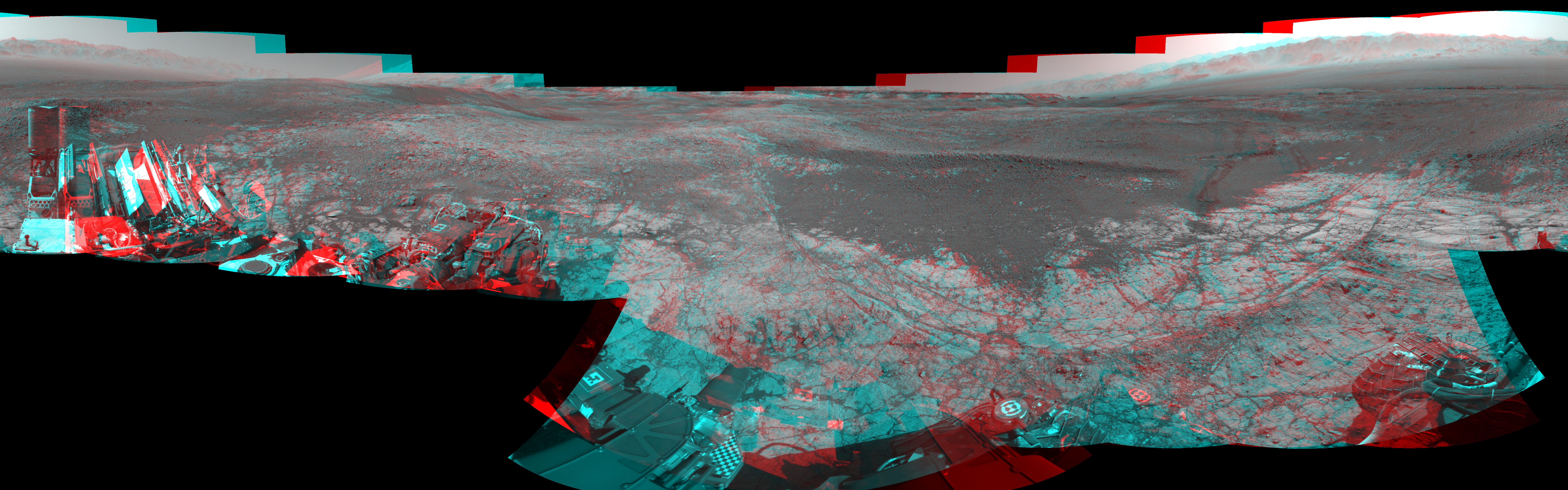 NASA's Mars rover Curiosity took 18 image pairs in Gale Crater using its mast-mounted Navigation Camera (Navcam) to create this mosaic. The seam-corrected mosaic provides a 360-degree cylindrical perspective projection panorama of the Martian surface suitable for stereo viewing, centered at 352 degrees azimuth (measured clockwise from north). This anaglyph must be viewed with red/blue glasses (red over left eye). Curiosity took the images on January 10, 2018, Sol 1930 of the Mars Science Laboratory mission at drive 2420, site number 67. The local mean solar time for the image exposures was 2 PM. Each Navcam image has a 45-degree field of view. CREDIT: NASA/JPL-Caltech