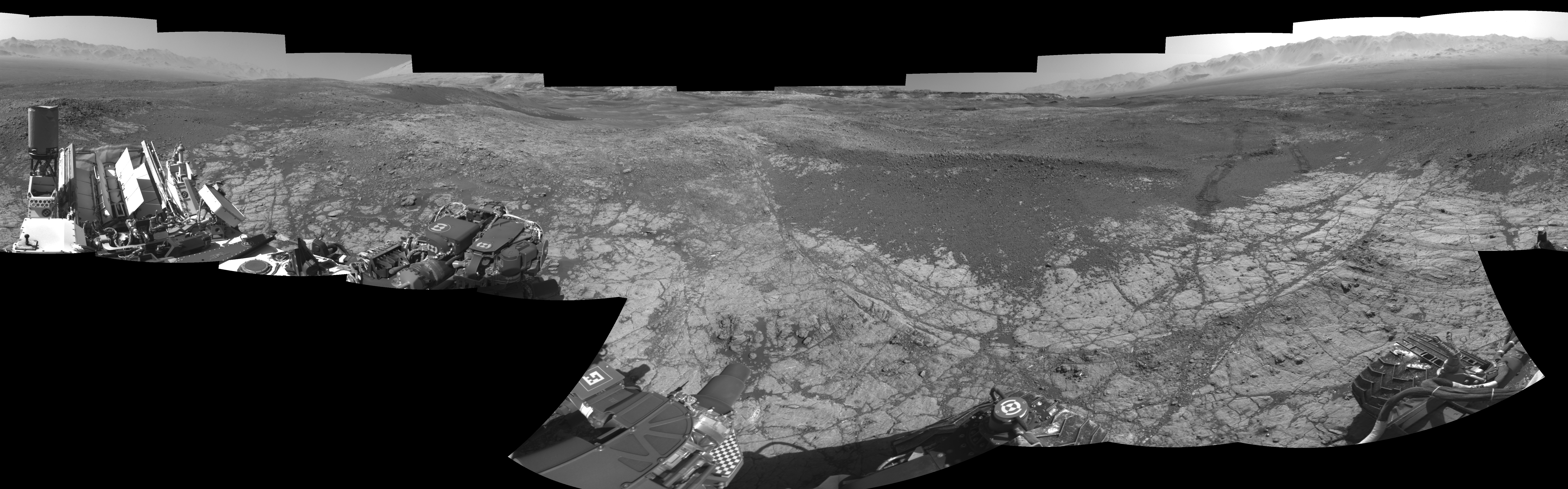 NASA's Mars rover Curiosity took 18 images in Gale Crater using its mast-mounted Right Navigation Camera (Navcam) to create this mosaic. The seam-corrected mosaic provides a 0-degree cylindrical-perspective projection panorama of the Martian surface suitable for stereo viewing, centered at 165 degrees azimuth (measured clockwise from north). This single-eye view must be combined with the partner left image to be viewed in stereo. Curiosity took the images on January 10, 2018, Sol 1930 of the Mars Science Laboratory mission at drive 2420, site number 67. The local mean solar time for the image exposures was 2 PM. Each Navcam image has a 45-degree field of view. CREDIT: NASA/JPL-Caltech