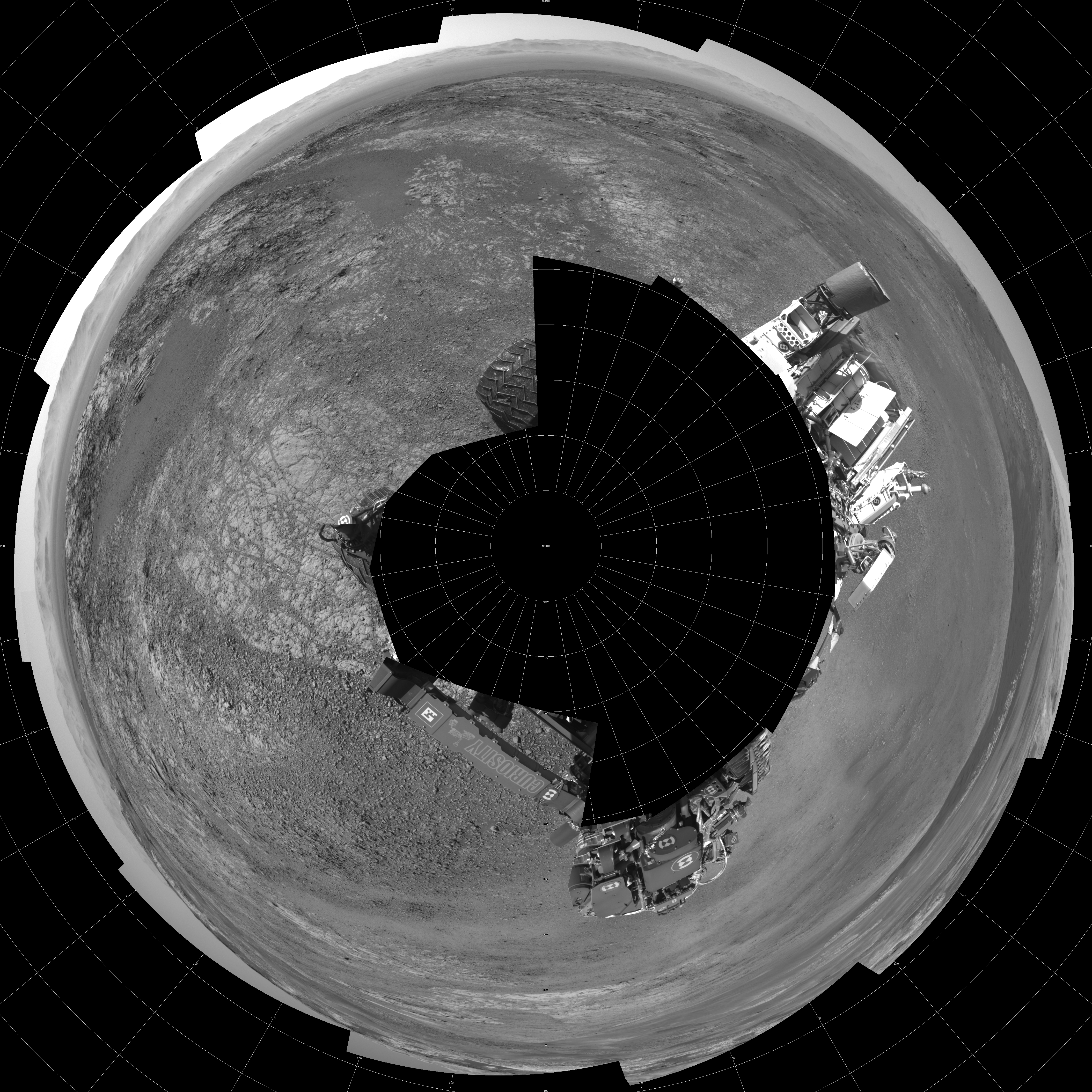 NASA's Mars rover Curiosity took 17 images in Gale Crater using its mast-mounted Left Navigation Camera (Navcam) to create this mosaic. The seam-corrected mosaic provides a polar stereographic projection panorama of the Martian surface with 0 degrees azimuth (measured clockwise from north) at the top of the image. Curiosity took the images on January 25, 2018, Sol 1944 of the Mars Science Laboratory mission at drive 2884, site number 67. The local mean solar time for the image exposures was from 1 PM to 2 PM. Each Navcam image has a 45-degree field of view. CREDIT: NASA/JPL-Caltech