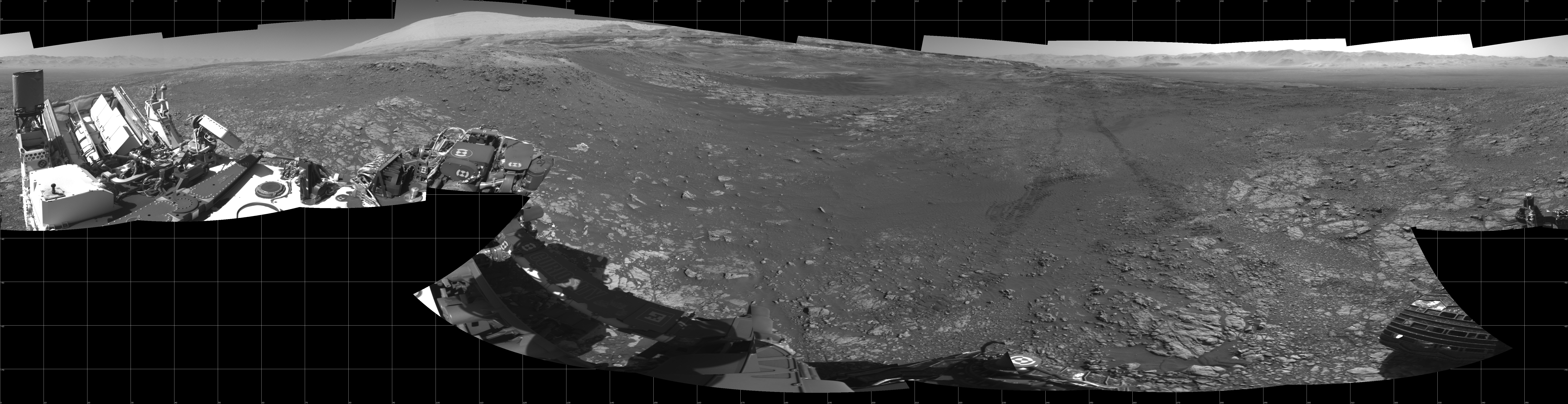 NASA's Mars rover Curiosity took 18 images in Gale Crater using its mast-mounted Left Navigation Camera (Navcam) to create this mosaic. The seam-corrected mosaic provides a 360-degree cylindrical projection panorama of the Martian surface centered at 180 degrees azimuth (measured clockwise from north). Curiosity took the images on January 30, 2018, Sol 1949 of the Mars Science Laboratory mission at drive 0, site number 68. The local mean solar time for the image exposures was 2 PM. Each Navcam image has a 45 degree field of view. CREDIT: NASA/JPL-Caltech