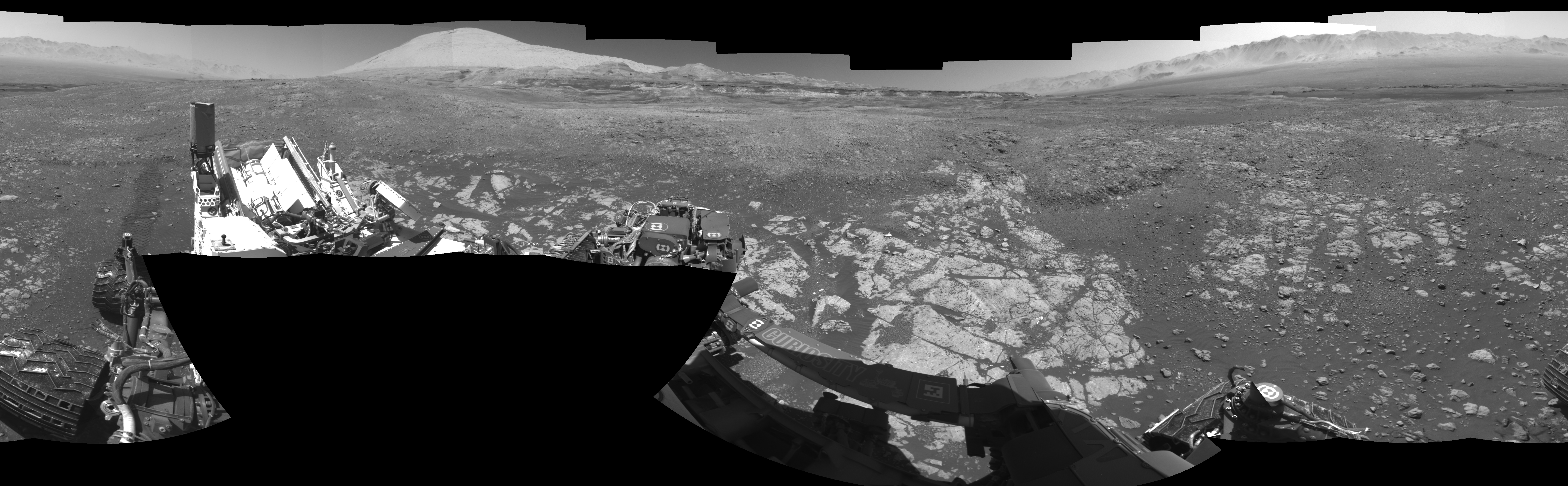 NASA's Mars rover Curiosity took 19 images in Gale Crater using its mast-mounted Left Navigation Camera (Navcam) to create this mosaic. The seam-corrected mosaic provides a 360-degree cylindrical-perspective projection panorama of the Martian surface suitable for stereo viewing, centered at 322 degrees azimuth (measured clockwise from north). This single-eye view must be combined with the partner right image to be viewed in stereo. Curiosity took the images on February 12, 2018, Sol 1962 of the Mars Science Laboratory mission at drive 580, site number 68. The local mean solar time for the image exposures was from 1 PM to 12 PM. Each Navcam image has a 45-degree field of view. CREDIT: NASA/JPL-Caltech
