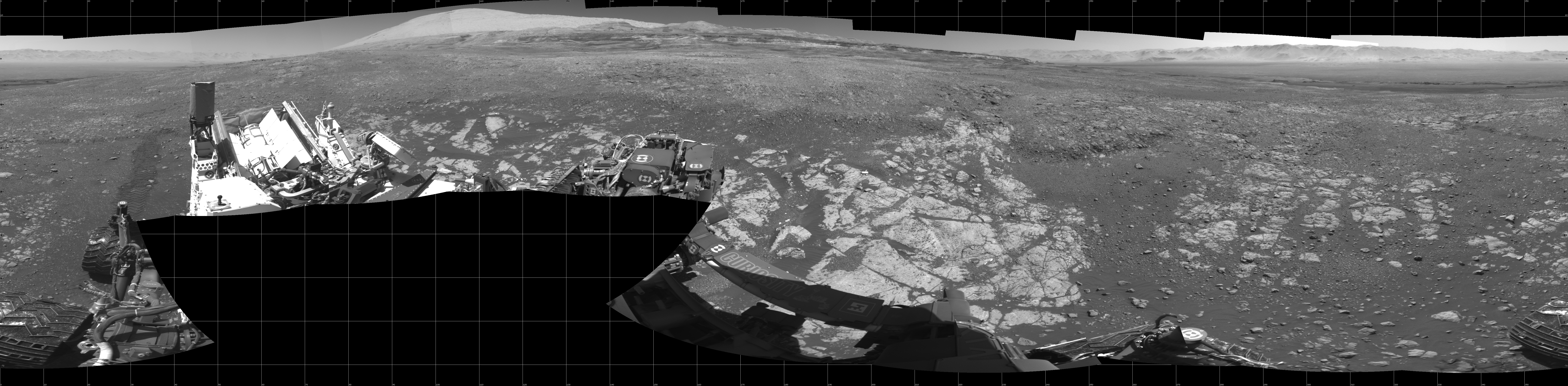NASA's Mars rover Curiosity took 19 images in Gale Crater using its mast-mounted Left Navigation Camera (Navcam) to create this mosaic. The seam-corrected mosaic provides a 360-degree cylindrical projection panorama of the Martian surface centered at 180 degrees azimuth (measured clockwise from north). Curiosity took the images on February 12, 2018, Sol 1962 of the Mars Science Laboratory mission at drive 580, site number 68. The local mean solar time for the image exposures was from 1 PM to 12 PM. Each Navcam image has a 45 degree field of view. CREDIT: NASA/JPL-Caltech