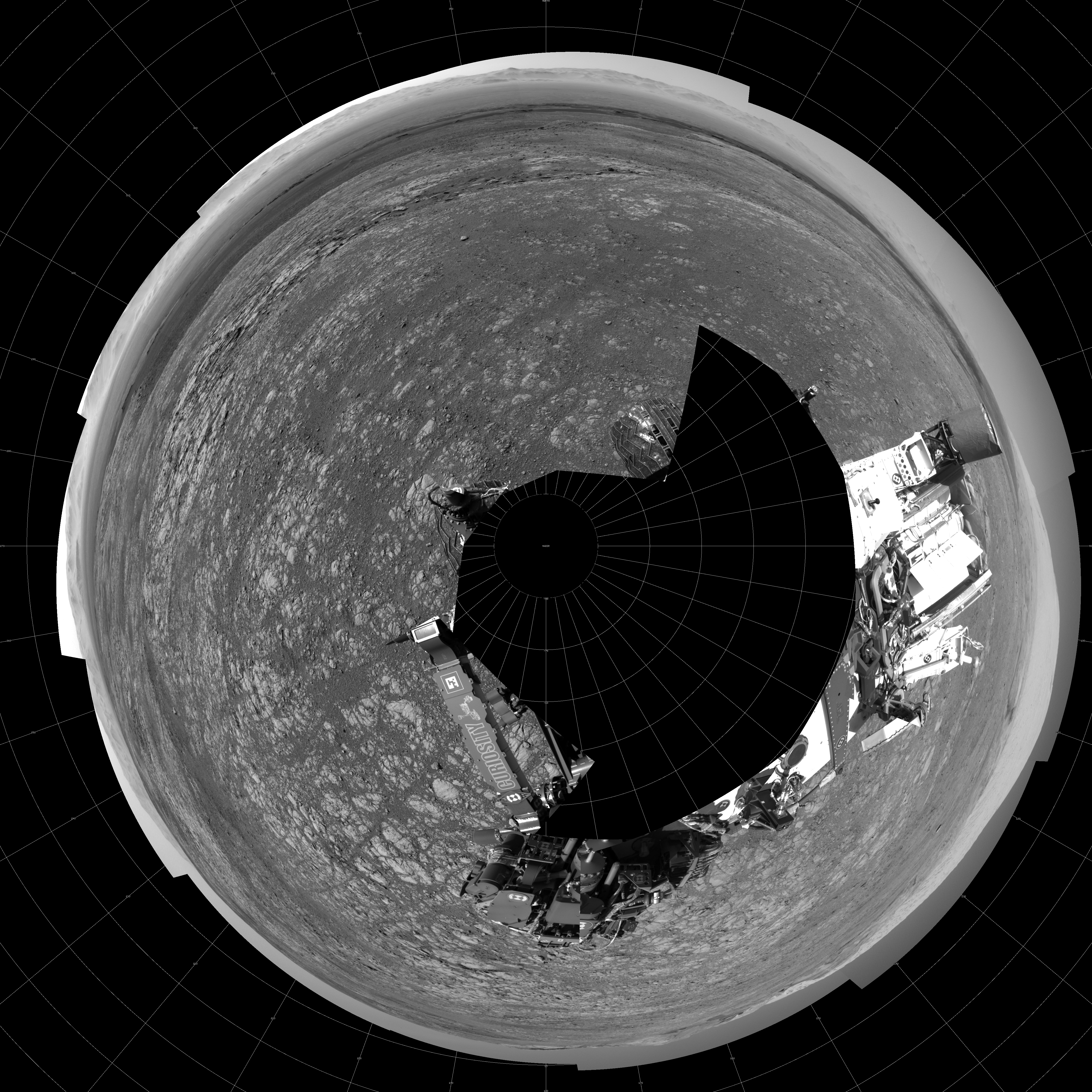 NASA's Mars rover Curiosity took 17 images in Gale Crater using its mast-mounted Left Navigation Camera (Navcam) to create this mosaic. The seam-corrected mosaic provides a polar stereographic projection panorama of the Martian surface with 0 degrees azimuth (measured clockwise from north) at the top of the image. Curiosity took the images on March 19, 2018, Sol 1996 of the Mars Science Laboratory mission at drive 2396, site number 68. The local mean solar time for the image exposures was 2 PM. Each Navcam image has a 45-degree field of view. CREDIT: NASA/JPL-Caltech