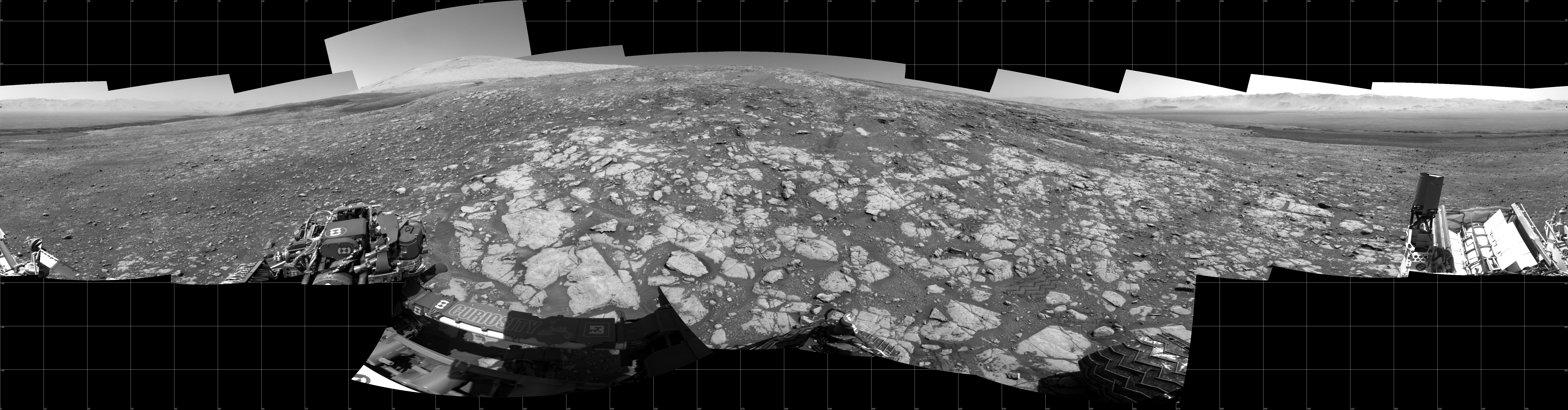 NASA's Mars rover Curiosity took 18 images in Gale Crater using its mast-mounted Left Navigation Camera (Navcam) to create this mosaic. The seam-corrected mosaic provides a 360-degree cylindrical projection panorama of the Martian surface centered at 180 degrees azimuth (measured clockwise from north). Curiosity took the images on March 22, 2018, Sols 1999-2000 of the Mars Science Laboratory mission at drive 2626, site number 68. The local mean solar time for the image exposures was from 1 PM to 11 AM. Each Navcam image has a 45 degree field of view. CREDIT: NASA/JPL-Caltech