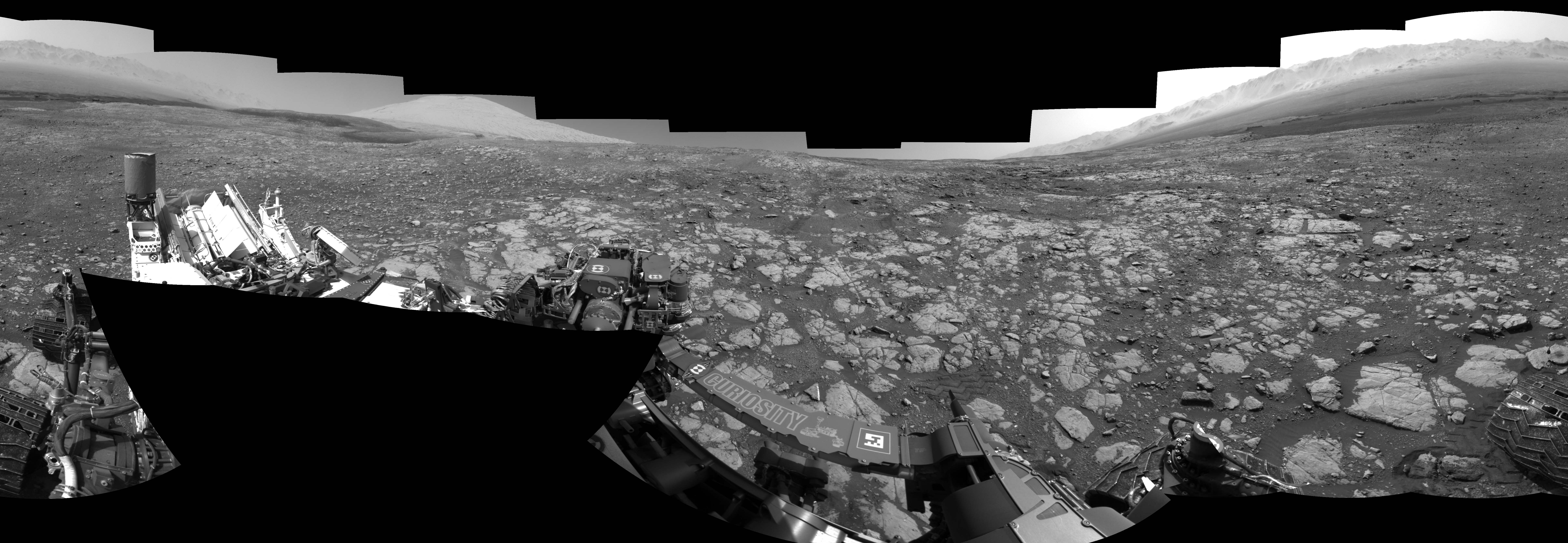 NASA's Mars rover Curiosity took 19 images in Gale Crater using its mast-mounted Left Navigation Camera (Navcam) to create this mosaic. The seam-corrected mosaic provides a 360-degree cylindrical-perspective projection panorama of the Martian surface suitable for stereo viewing, centered at 335 degrees azimuth (measured clockwise from north). This single-eye view must be combined with the partner right image to be viewed in stereo. Curiosity took the images on March 26, 2018, Sol 2003 of the Mars Science Laboratory mission at drive 0, site number 69. The local mean solar time for the image exposures was 2 PM. Each Navcam image has a 45-degree field of view. CREDIT: NASA/JPL-Caltech