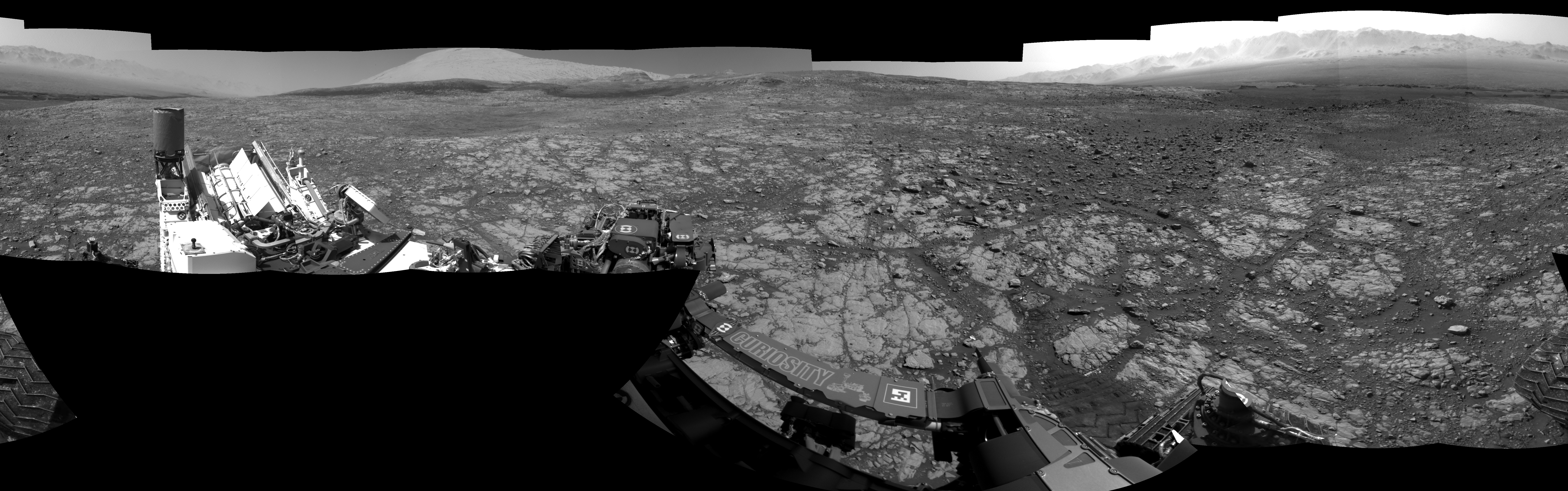 NASA's Mars rover Curiosity took 18 images in Gale Crater using its mast-mounted Left Navigation Camera (Navcam) to create this mosaic. The seam-corrected mosaic provides a 360-degree cylindrical-perspective projection panorama of the Martian surface suitable for stereo viewing, centered at 329 degrees azimuth (measured clockwise from north). This single-eye view must be combined with the partner right image to be viewed in stereo. Curiosity took the images on March 27, 2018, Sol 2004 of the Mars Science Laboratory mission at drive 408, site number 69. The local mean solar time for the image exposures was from 1 PM to 3 PM. Each Navcam image has a 45-degree field of view. CREDIT: NASA/JPL-Caltech