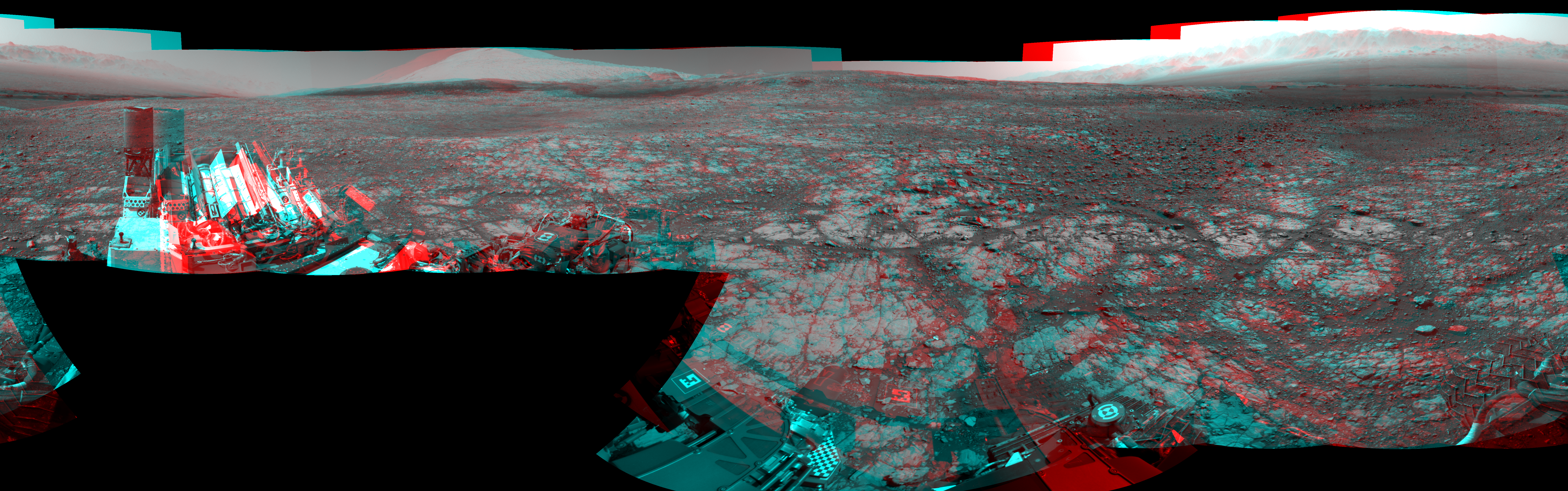 NASA's Mars rover Curiosity took 18 image pairs in Gale Crater using its mast-mounted Navigation Camera (Navcam) to create this mosaic. The seam-corrected mosaic provides a 360-degree cylindrical perspective projection panorama of the Martian surface suitable for stereo viewing, centered at 329 degrees azimuth (measured clockwise from north). This anaglyph must be viewed with red/blue glasses (red over left eye). Curiosity took the images on March 27, 2018, Sol 2004 of the Mars Science Laboratory mission at drive 408, site number 69. The local mean solar time for the image exposures was from 1 PM to 3 PM. Each Navcam image has a 45-degree field of view. CREDIT: NASA/JPL-Caltech