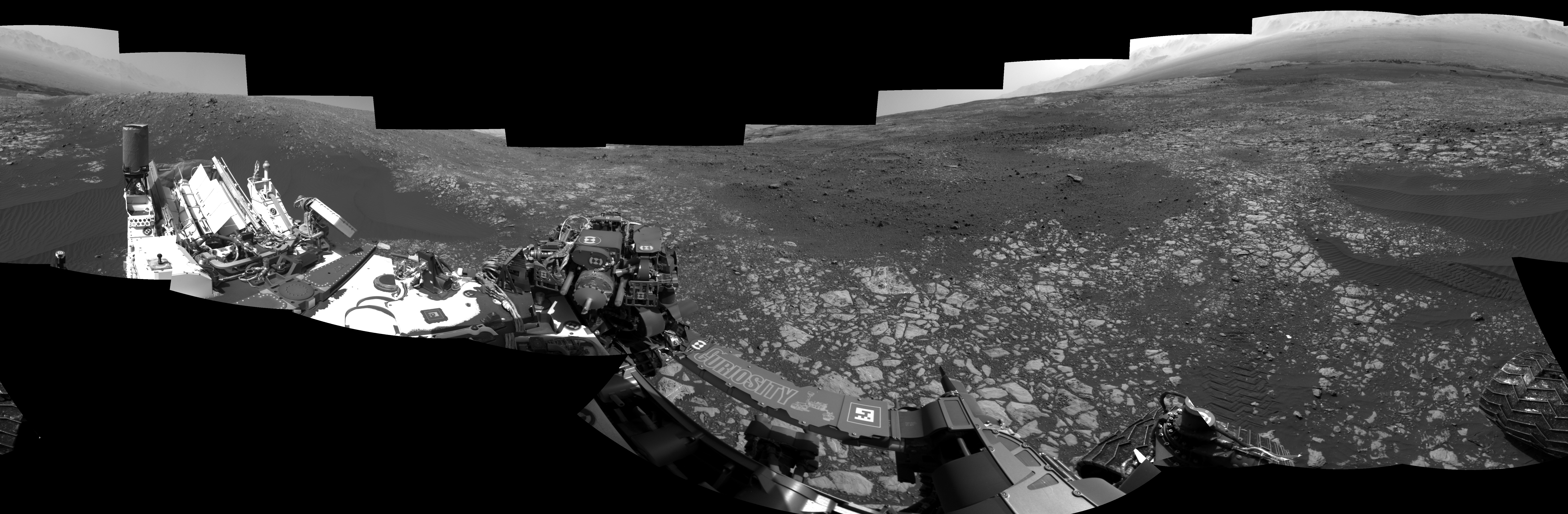 NASA's Mars rover Curiosity took 18 images in Gale Crater using its mast-mounted Left Navigation Camera (Navcam) to create this mosaic. The seam-corrected mosaic provides a 360-degree cylindrical-perspective projection panorama of the Martian surface suitable for stereo viewing, centered at 338 degrees azimuth (measured clockwise from north). This single-eye view must be combined with the partner right image to be viewed in stereo. Curiosity took the images on April 04, 2018, Sol 2012 of the Mars Science Laboratory mission at drive 1384, site number 69. The local mean solar time for the image exposures was 2 PM. Each Navcam image has a 45-degree field of view. CREDIT: NASA/JPL-Caltech