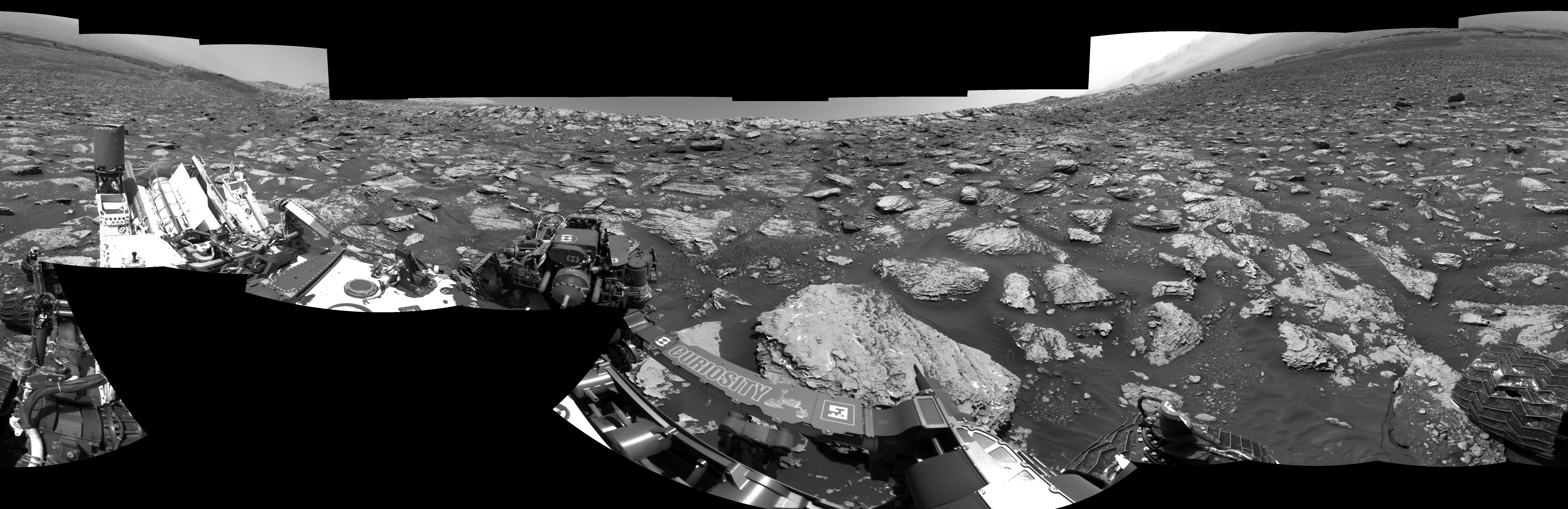 NASA's Mars rover Curiosity took 19 images in Gale Crater using its mast-mounted Left Navigation Camera (Navcam) to create this mosaic. The seam-corrected mosaic provides a 360-degree cylindrical-perspective projection panorama of the Martian surface suitable for stereo viewing, centered at 343 degrees azimuth (measured clockwise from north). This single-eye view must be combined with the partner right image to be viewed in stereo. Curiosity took the images on May 10, 2018, Sol 2047 of the Mars Science Laboratory mission at drive 1538, site number 70. The local mean solar time for the image exposures was 1 PM. Each Navcam image has a 45-degree field of view. CREDIT: NASA/JPL-Caltech