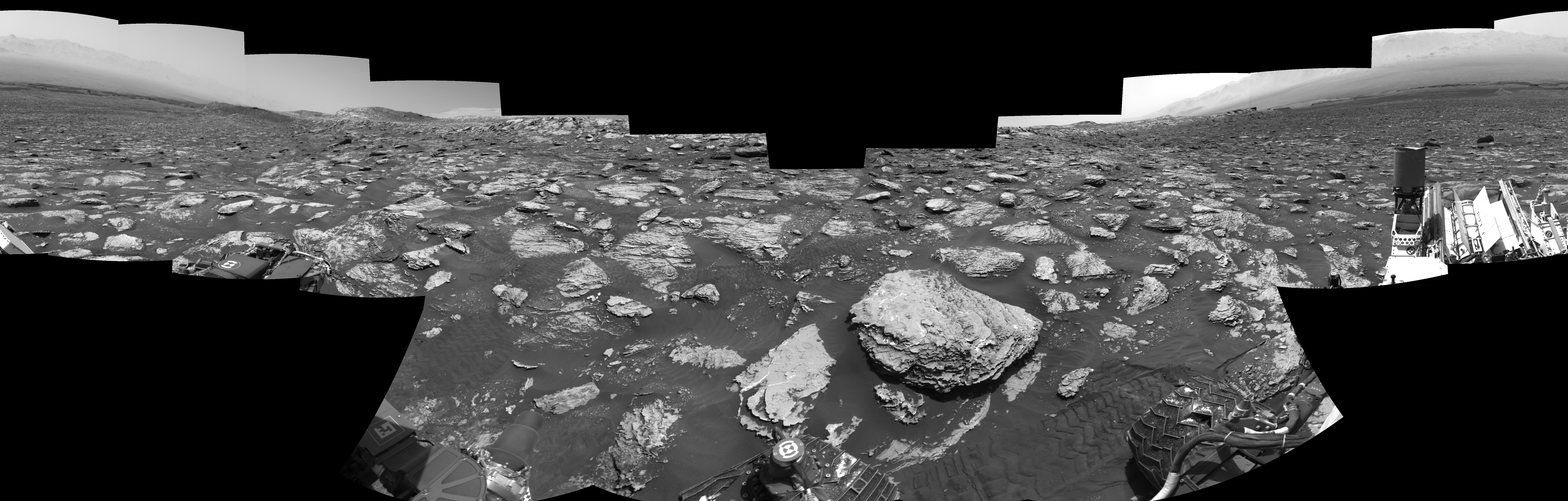 NASA's Mars rover Curiosity took 17 images in Gale Crater using its mast-mounted Right Navigation Camera (Navcam) to create this mosaic. The seam-corrected mosaic provides a 0-degree cylindrical-perspective projection panorama of the Martian surface suitable for stereo viewing, centered at 212 degrees azimuth (measured clockwise from north). This single-eye view must be combined with the partner left image to be viewed in stereo. Curiosity took the images on May 15, 2018, Sol 2051 of the Mars Science Laboratory mission at drive 1554, site number 70. The local mean solar time for the image exposures was 1 PM. Each Navcam image has a 45-degree field of view. CREDIT: NASA/JPL-Caltech