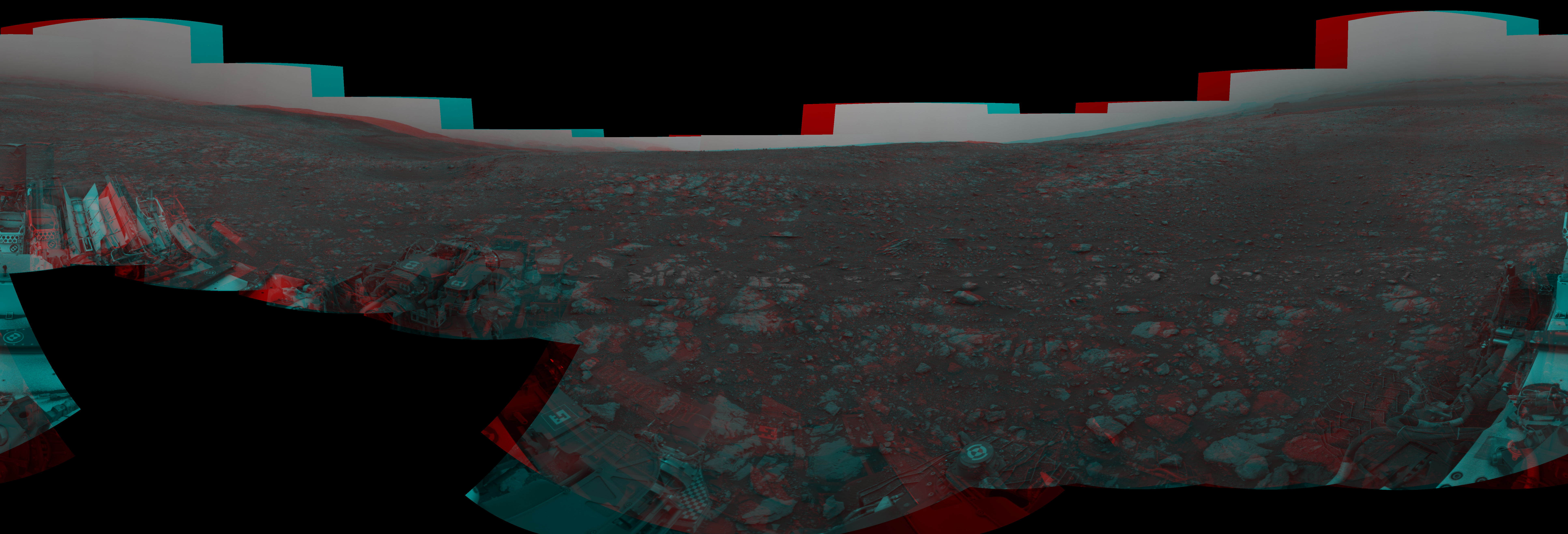 NASA's Mars rover Curiosity took 19 image pairs in Gale Crater using its mast-mounted Navigation Camera (Navcam) to create this mosaic. The seam-corrected mosaic provides a 360-degree cylindrical perspective projection panorama of the Martian surface suitable for stereo viewing, centered at 360 degrees azimuth (measured clockwise from north). This anaglyph must be viewed with red/blue glasses (red over left eye). Curiosity took the images on July 20, 2018, Sol 2116 of the Mars Science Laboratory mission at drive 0, site number 72. The local mean solar time for the image exposures was from 1 PM to 3 PM. Each Navcam image has a 45-degree field of view. CREDIT: NASA/JPL-Caltech