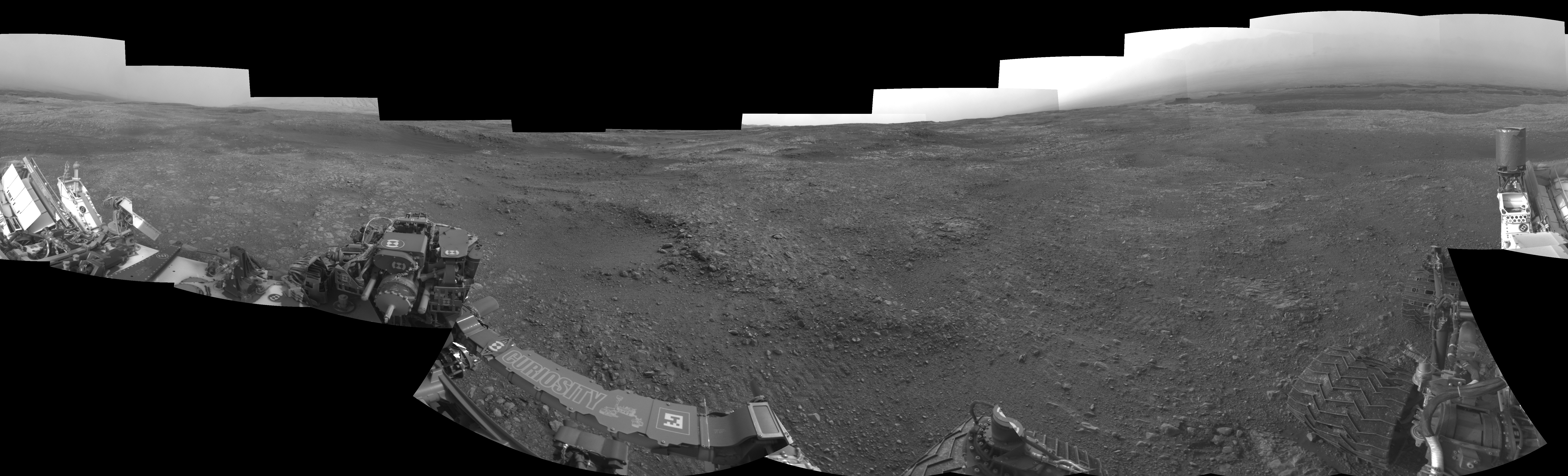 NASA's Mars rover Curiosity took 18 images in Gale Crater using its mast-mounted Left Navigation Camera (Navcam) to create this mosaic. The seam-corrected mosaic provides a 360-degree cylindrical-perspective projection panorama of the Martian surface suitable for stereo viewing, centered at 22 degrees azimuth (measured clockwise from north). This single-eye view must be combined with the partner right image to be viewed in stereo. Curiosity took the images on September 05, 2018, Sol 2161 of the Mars Science Laboratory mission at drive 2272, site number 72. The local mean solar time for the image exposures was from 2 PM to 3 PM. Each Navcam image has a 45-degree field of view. CREDIT: NASA/JPL-Caltech
