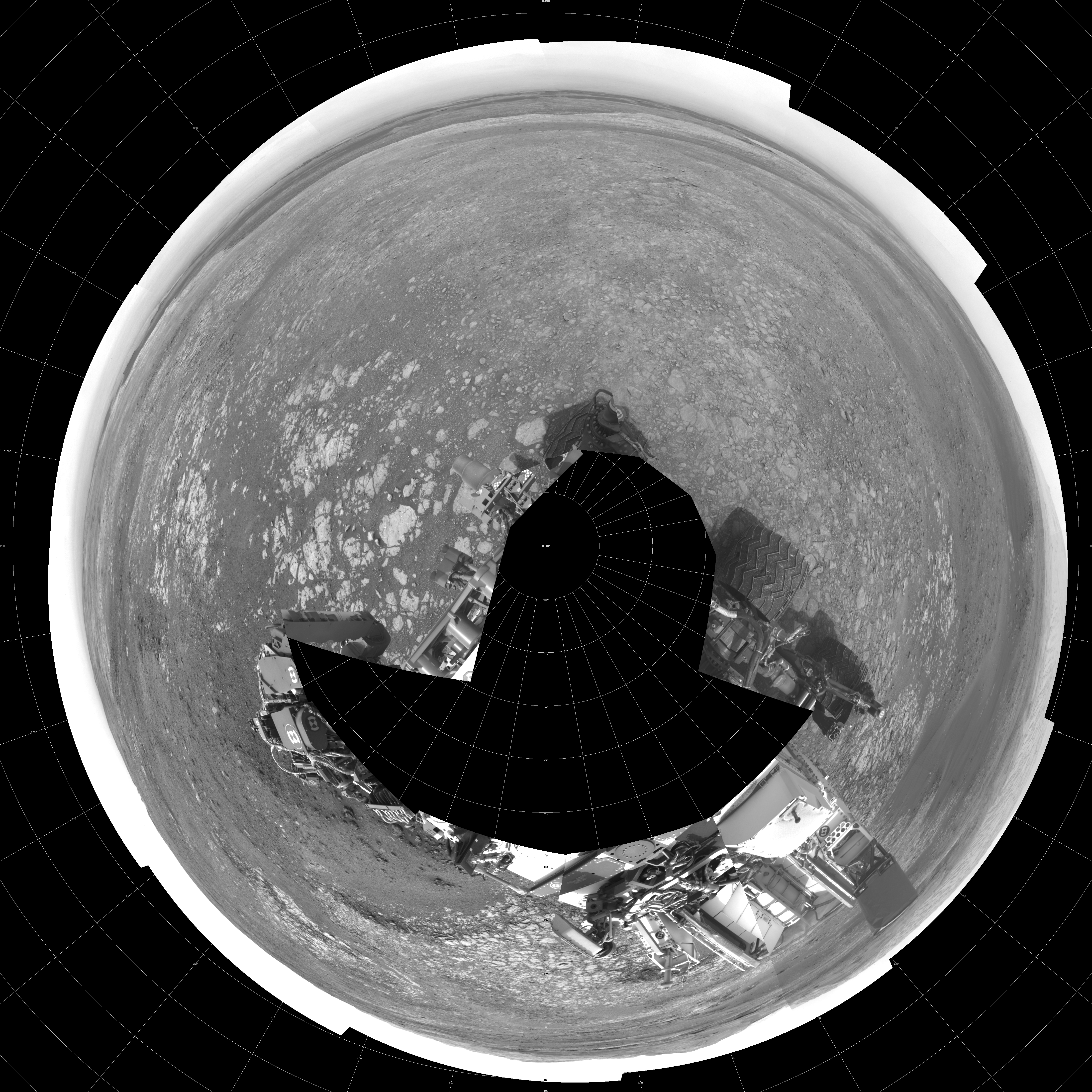 NASA's Mars rover Curiosity took 19 images in Gale Crater using its mast-mounted Left Navigation Camera (Navcam) to create this mosaic. The seam-corrected mosaic provides a polar stereographic projection panorama of the Martian surface with 0 degrees azimuth (measured clockwise from north) at the top of the image. Curiosity took the images on September 10, 2018, Sol 2166 of the Mars Science Laboratory mission at drive 2464, site number 72. The local mean solar time for the image exposures was from 2 PM to 12 PM. Each Navcam image has a 45-degree field of view. CREDIT: NASA/JPL-Caltech