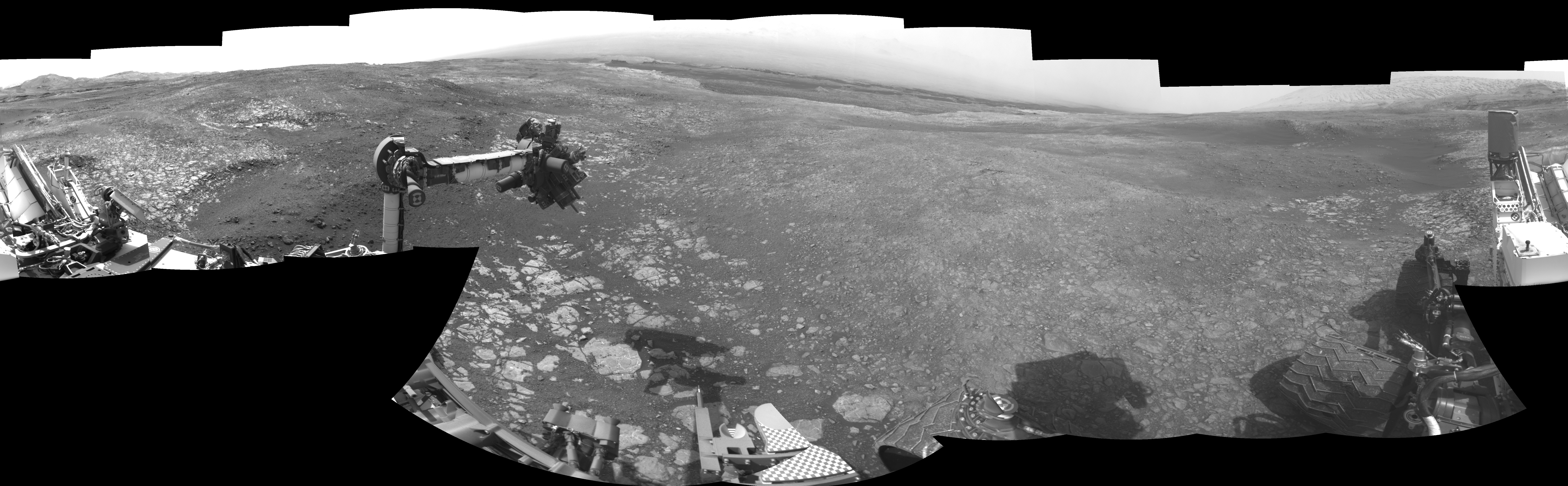 NASA's Mars rover Curiosity took 19 images in Gale Crater using its mast-mounted Left Navigation Camera (Navcam) to create this mosaic. The seam-corrected mosaic provides a 360-degree cylindrical-perspective projection panorama of the Martian surface suitable for stereo viewing, centered at 23 degrees azimuth (measured clockwise from north). This single-eye view must be combined with the partner right image to be viewed in stereo. Curiosity took the images on October 29, 2018, Sol 2214 of the Mars Science Laboratory mission at drive 0, site number 73. The local mean solar time for the image exposures was 2 PM. Each Navcam image has a 45-degree field of view. CREDIT: NASA/JPL-Caltech