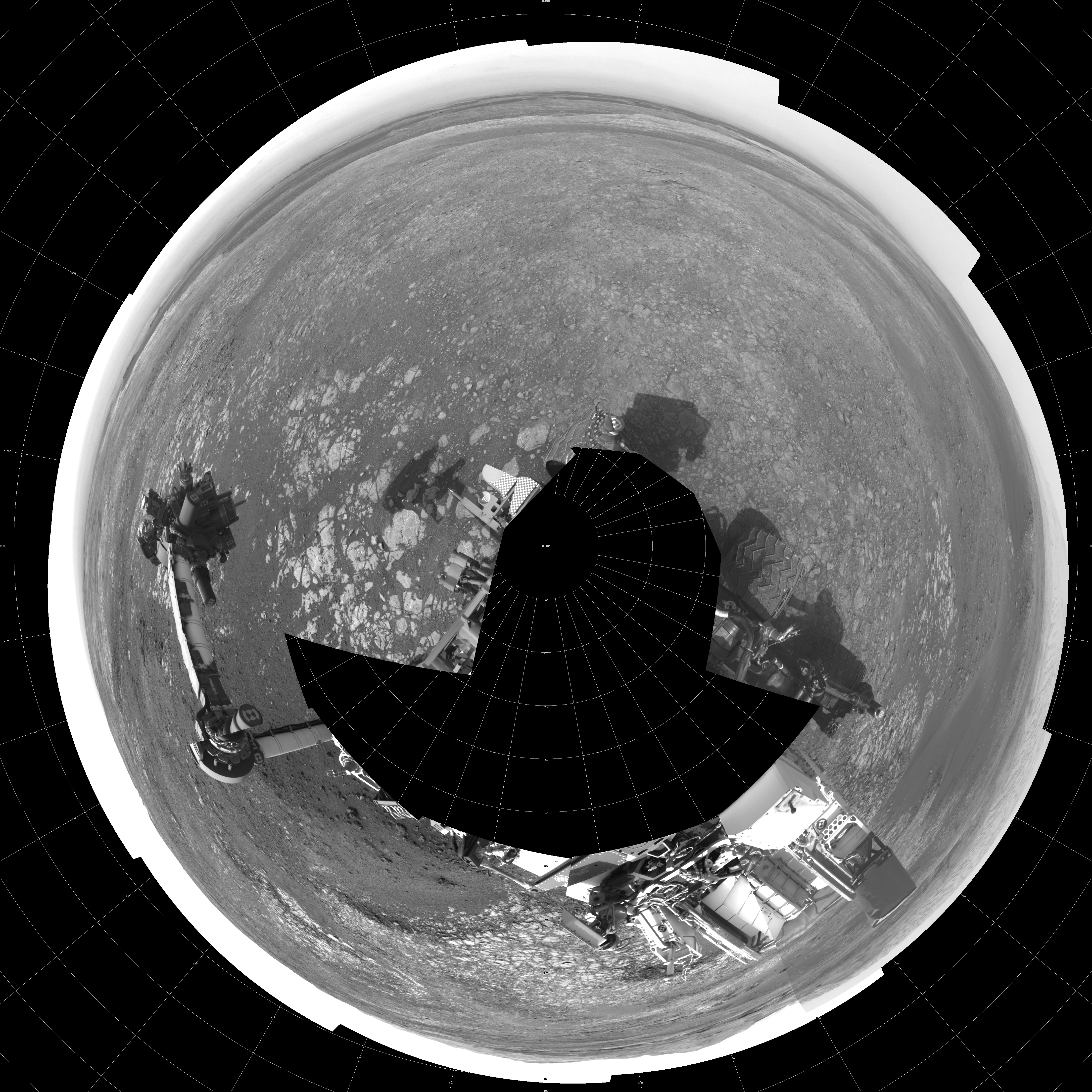 NASA's Mars rover Curiosity took 19 images in Gale Crater using its mast-mounted Left Navigation Camera (Navcam) to create this mosaic. The seam-corrected mosaic provides a polar stereographic projection panorama of the Martian surface with 0 degrees azimuth (measured clockwise from north) at the top of the image. Curiosity took the images on October 29, 2018, Sol 2214 of the Mars Science Laboratory mission at drive 0, site number 73. The local mean solar time for the image exposures was 2 PM. Each Navcam image has a 45-degree field of view. CREDIT: NASA/JPL-Caltech