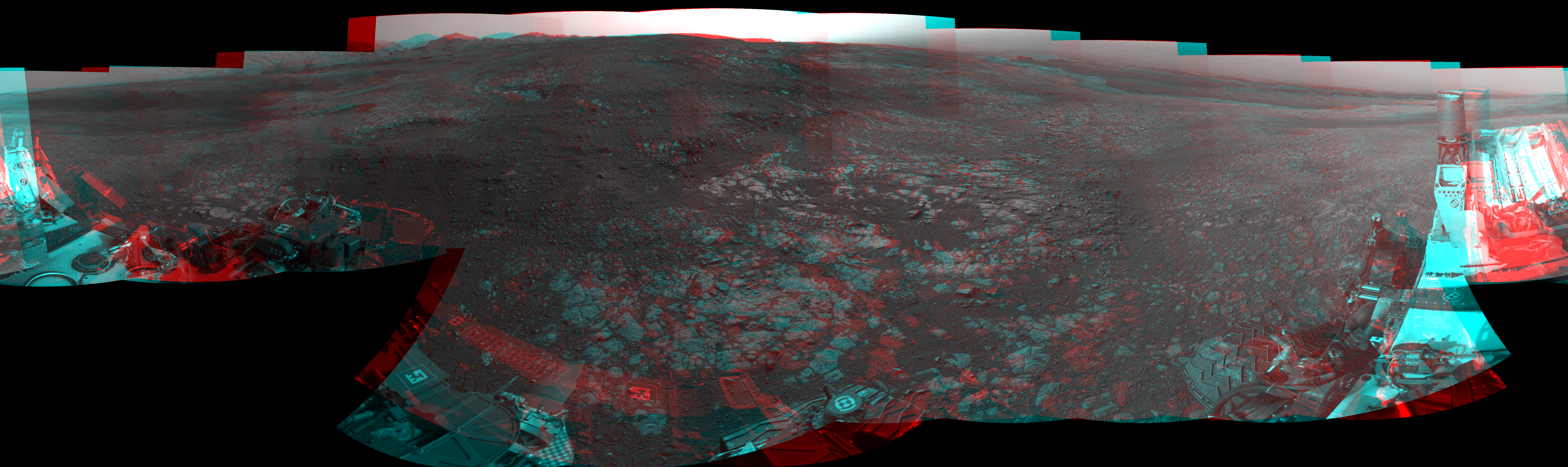 NASA's Mars rover Curiosity took 19 image pairs in Gale Crater using its mast-mounted Navigation Camera (Navcam) to create this mosaic. The seam-corrected mosaic provides a 360-degree cylindrical perspective projection panorama of the Martian surface suitable for stereo viewing, centered at 30 degrees azimuth (measured clockwise from north). This anaglyph must be viewed with red/blue glasses (red over left eye). Curiosity took the images on November 02, 2018, Sol 2218 of the Mars Science Laboratory mission at drive 46, site number 73. The local mean solar time for the image exposures was 4 PM. Each Navcam image has a 45-degree field of view. CREDIT: NASA/JPL-Caltech