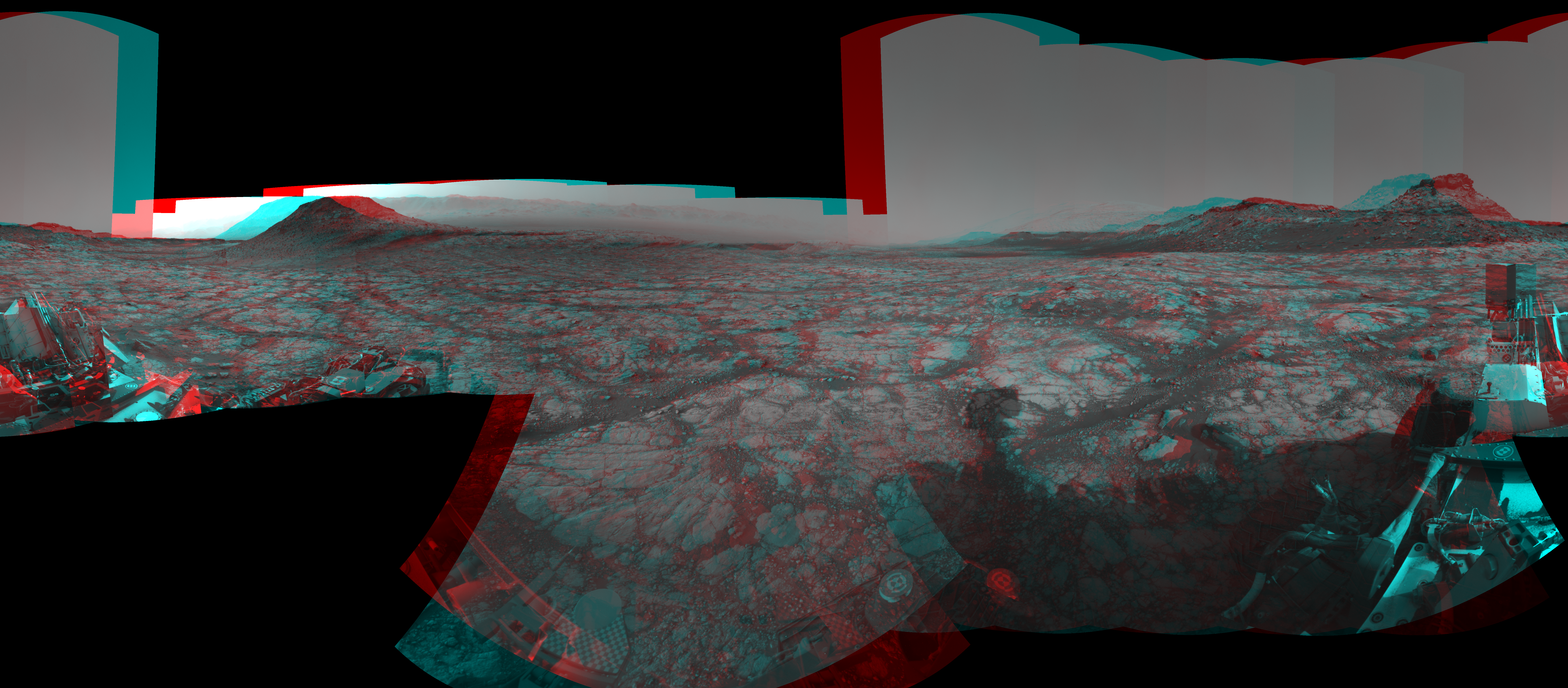 NASA's Mars rover Curiosity took 24 image pairs in Gale Crater using its mast-mounted Navigation Camera (Navcam) to create this mosaic. The seam-corrected mosaic provides a 360-degree cylindrical perspective projection panorama of the Martian surface suitable for stereo viewing, centered at 20 degrees azimuth (measured clockwise from north). This anaglyph must be viewed with red/blue glasses (red over left eye). Curiosity took the images on May 01, 2020, Sols 2749-2747 of the Mars Science Laboratory mission at drive 2008, site number 79. The local mean solar time for the image exposures was from 3 PM to 12 PM. Each Navcam image has a 45-degree field of view. CREDIT: NASA/JPL-Caltech