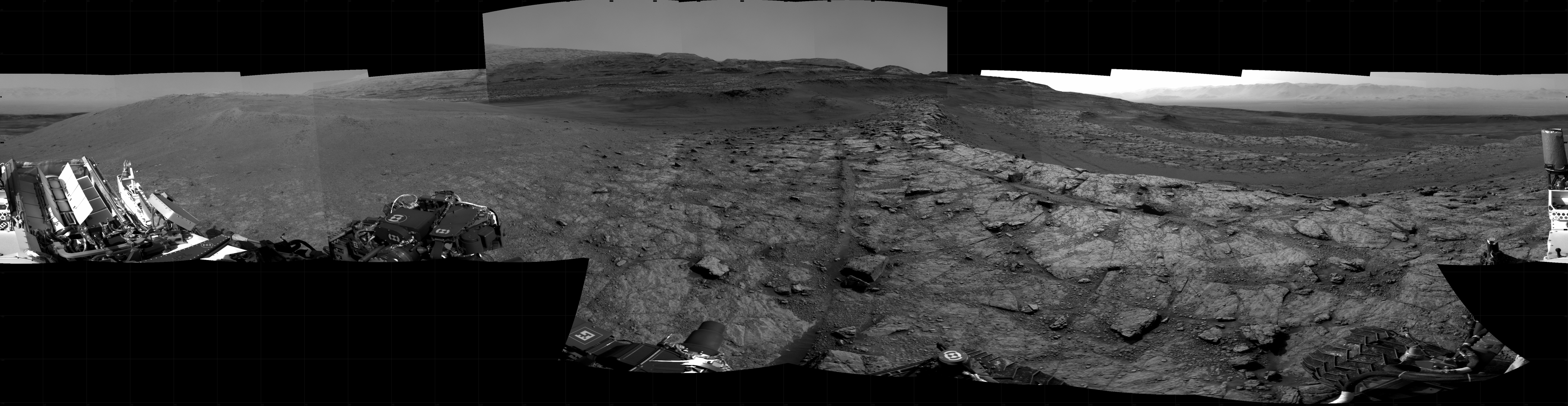 NASA's Mars rover Curiosity took 20 images in Gale Crater using its mast-mounted Right Navigation Camera (Navcam) to create this mosaic. The seam-corrected mosaic provides a 360-degree cylindrical projection panorama of the Martian surface centered at 180 degrees azimuth (measured clockwise from north). Curiosity took the images on November 18, 2020, Sols 2945-2943 of the Mars Science Laboratory mission at drive 1974, site number 83. The local mean solar time for the image exposures was from 4 PM to 12 PM. Each Navcam image has a 45 degree field of view. CREDIT: NASA/JPL-Caltech