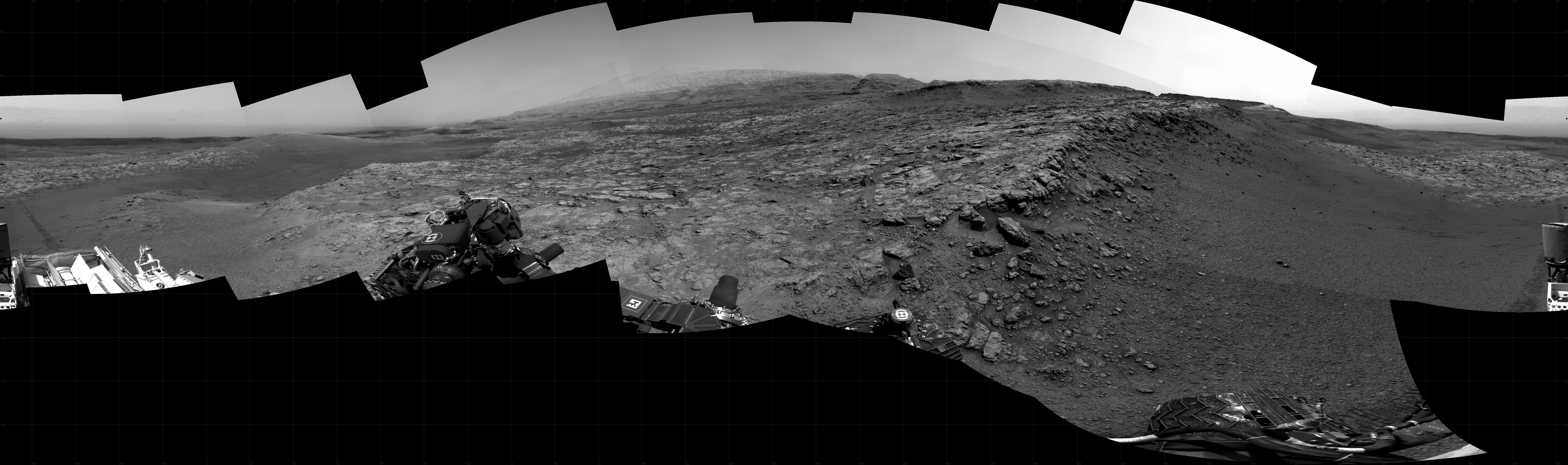 NASA's Mars rover Curiosity took 23 images in Gale Crater using its mast-mounted Right Navigation Camera (Navcam) to create this mosaic. The seam-corrected mosaic provides a 360-degree cylindrical projection panorama of the Martian surface centered at 133 degrees azimuth (measured clockwise from north). Curiosity took the images on November 23, 2020, Sol 2950 of the Mars Science Laboratory mission at drive 2580, site number 83. The local mean solar time for the image exposures was 2 PM. Each Navcam image has a 45 degree field of view. CREDIT: NASA/JPL-Caltech