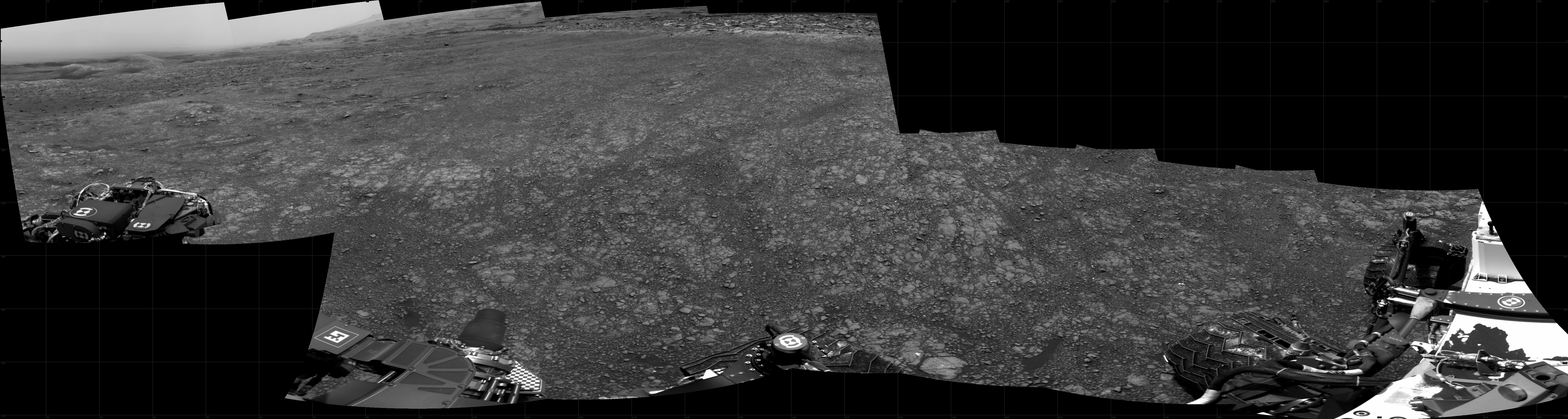 NASA's Mars rover Curiosity took 12 images in Gale Crater using its mast-mounted Right Navigation Camera (Navcam) to create this mosaic. The seam-corrected mosaic provides a 295-degree cylindrical projection panorama of the Martian surface centered at 159 degrees azimuth (measured clockwise from north). Curiosity took the images on December 02, 2020, Sol 2959 of the Mars Science Laboratory mission at drive 540, site number 84. The local mean solar time for the image exposures was 1 PM. Each Navcam image has a 45 degree field of view. CREDIT: NASA/JPL-Caltech