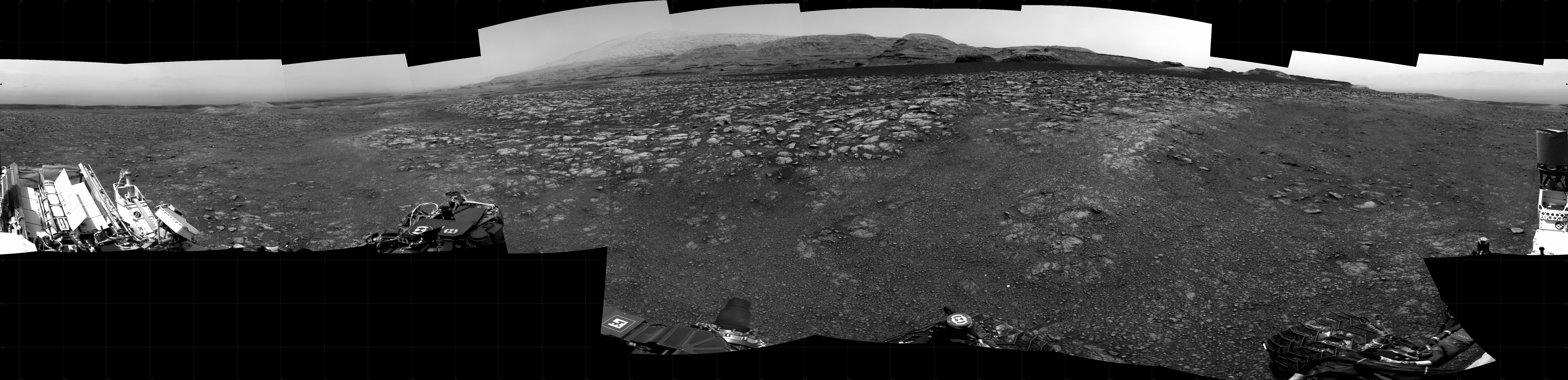 NASA's Mars rover Curiosity took 22 images in Gale Crater using its mast-mounted Right Navigation Camera (Navcam) to create this mosaic. The seam-corrected mosaic provides a 360-degree cylindrical projection panorama of the Martian surface centered at 136 degrees azimuth (measured clockwise from north). Curiosity took the images on December 14, 2020, Sol 2970 of the Mars Science Laboratory mission at drive 1492, site number 84. The local mean solar time for the image exposures was 2 PM. Each Navcam image has a 45 degree field of view. CREDIT: NASA/JPL-Caltech