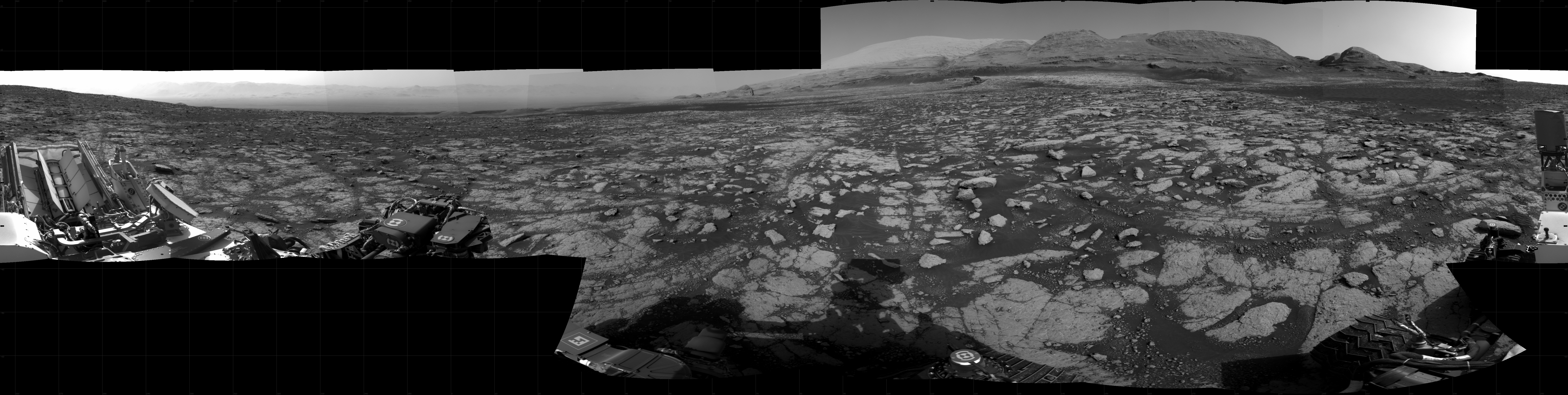 NASA's Mars rover Curiosity took 21 images in Gale Crater using its mast-mounted Right Navigation Camera (Navcam) to create this mosaic. The seam-corrected mosaic provides a 360-degree cylindrical projection panorama of the Martian surface centered at 77 degrees azimuth (measured clockwise from north). Curiosity took the images on February 22, 2021, Sol 3038 of the Mars Science Laboratory mission at drive 2146, site number 86. The local mean solar time for the image exposures was from 3 PM to 4 PM. Each Navcam image has a 45 degree field of view. CREDIT: NASA/JPL-Caltech
