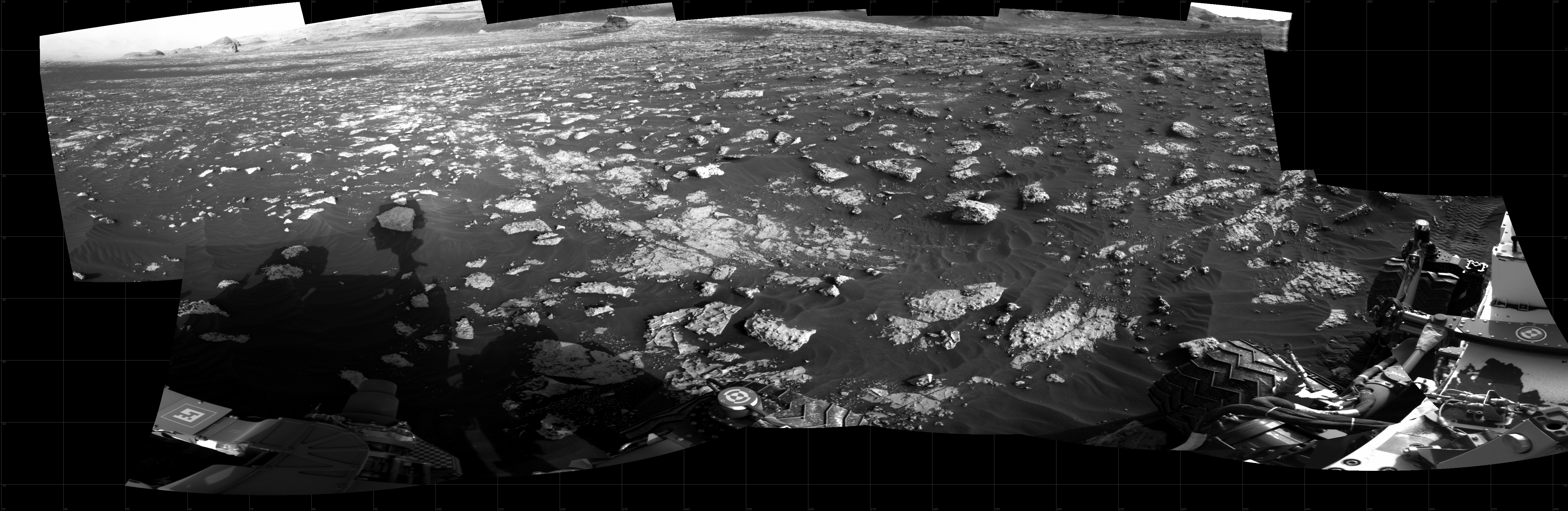 NASA's Mars rover Curiosity took 14 images in Gale Crater using its mast-mounted Right Navigation Camera (Navcam) to create this mosaic. The seam-corrected mosaic provides a 253-degree cylindrical projection panorama of the Martian surface centered at 156 degrees azimuth (measured clockwise from north). Curiosity took the images on February 26, 2021, Sol 3042 of the Mars Science Laboratory mission at drive 2596, site number 86. The local mean solar time for the image exposures was 5 PM. Each Navcam image has a 45 degree field of view. CREDIT: NASA/JPL-Caltech