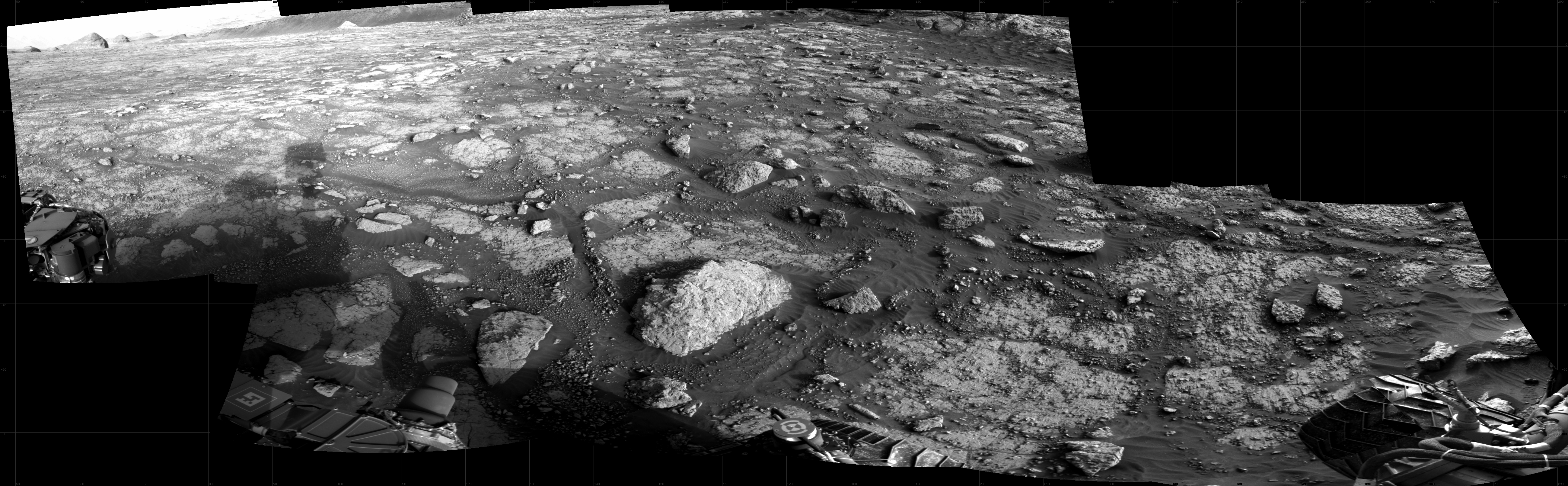 NASA's Mars rover Curiosity took 10 images in Gale Crater using its mast-mounted Right Navigation Camera (Navcam) to create this mosaic. The seam-corrected mosaic provides a 244-degree cylindrical projection panorama of the Martian surface centered at 170 degrees azimuth (measured clockwise from north). Curiosity took the images on March 03, 2021, Sol 3047 of the Mars Science Laboratory mission at drive 420, site number 87. The local mean solar time for the image exposures was from 5 PM to 6 PM. Each Navcam image has a 45 degree field of view. CREDIT: NASA/JPL-Caltech