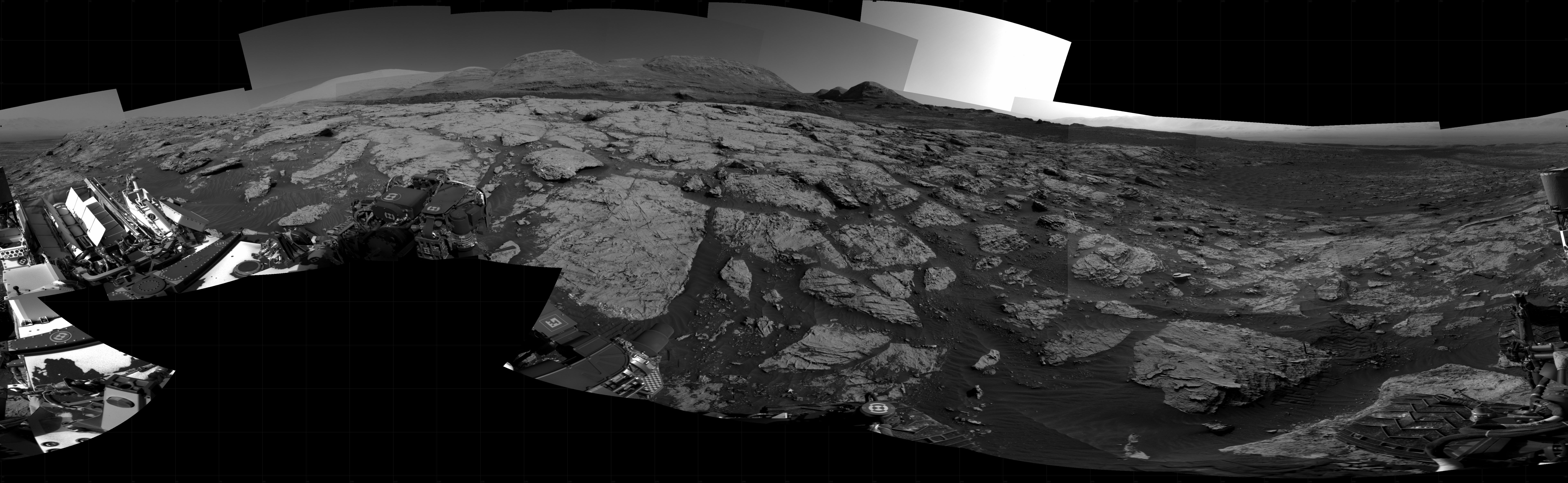 NASA's Mars rover Curiosity took 24 images in Gale Crater using its mast-mounted Right Navigation Camera (Navcam) to create this mosaic. The seam-corrected mosaic provides a 360-degree cylindrical projection panorama of the Martian surface centered at 200 degrees azimuth (measured clockwise from north). Curiosity took the images on April 09, 2021, Sol 3083 of the Mars Science Laboratory mission at drive 2214, site number 87. The local mean solar time for the image exposures was from 3 PM to 4 PM. Each Navcam image has a 45 degree field of view. CREDIT: NASA/JPL-Caltech