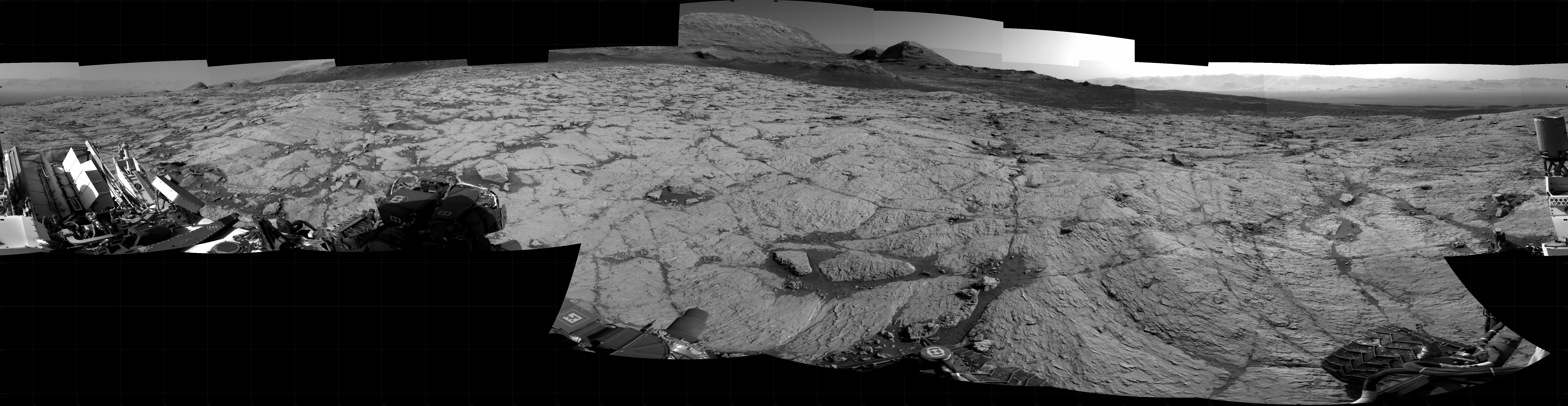 NASA's Mars rover Curiosity took 20 images in Gale Crater using its mast-mounted Right Navigation Camera (Navcam) to create this mosaic. The seam-corrected mosaic provides a 360-degree cylindrical projection panorama of the Martian surface centered at 192 degrees azimuth (measured clockwise from north). Curiosity took the images on May 17, 2021, Sol 3120 of the Mars Science Laboratory mission at drive 366, site number 88. The local mean solar time for the image exposures was 3 PM. Each Navcam image has a 45 degree field of view. CREDIT: NASA/JPL-Caltech
