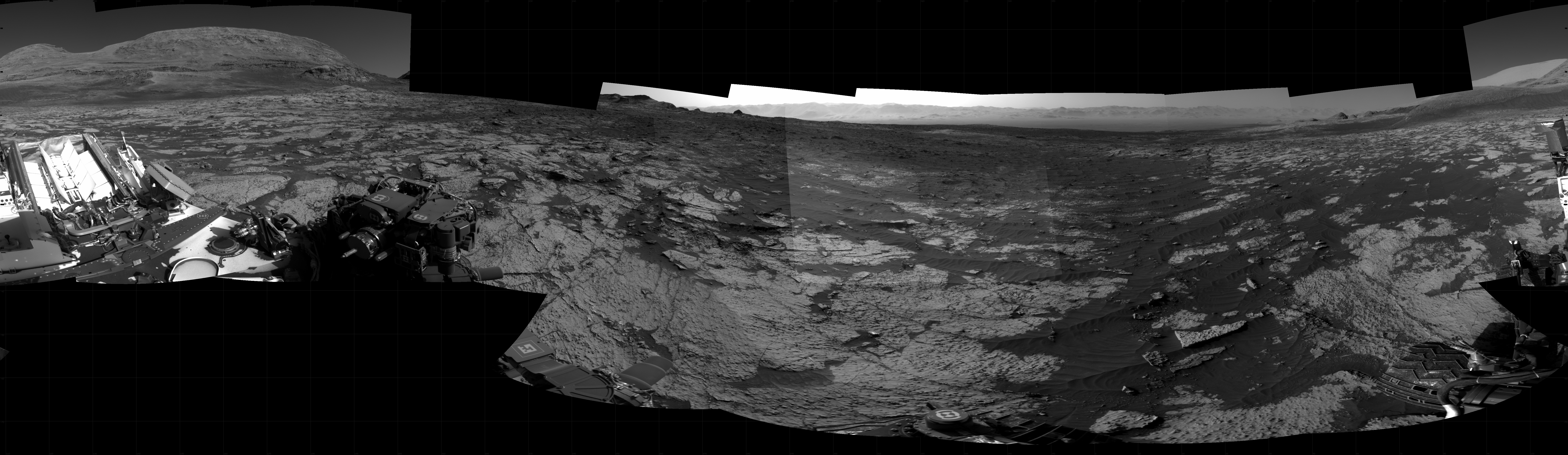 NASA's Mars rover Curiosity took 20 images in Gale Crater using its mast-mounted Right Navigation Camera (Navcam) to create this mosaic. The seam-corrected mosaic provides a 360-degree cylindrical projection panorama of the Martian surface centered at 289 degrees azimuth (measured clockwise from north). Curiosity took the images on June 14, 2021, Sol 3147 of the Mars Science Laboratory mission at drive 2794, site number 88. The local mean solar time for the image exposures was from 3 PM to 4 PM. Each Navcam image has a 45 degree field of view. CREDIT: NASA/JPL-Caltech